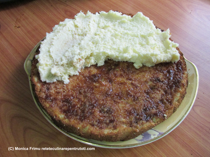 Preparăm foaia de doboș. Mixăm spumă tare albușurile cu un praf de sare, 2 linguri de zahăr și apă. Mixăm gălbenușurile cu 2 linguri de zahăr, le încorporăm în albușuri, amestecănd cu o lingură. Punem făina și omogenizăm. Întindem compoziția uniform într-o tavă tapetată cu hârtie de copt. Punem în cuptorul preîncălzit la foc mai mare (200) 15 min., Răcim și îndepărtăm hârtia.