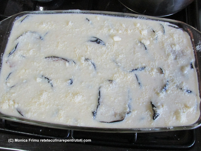 Într-un vas Yena turnăm un strat subțire de sos Bechamel, așezăm ½ vinete într-un strat.