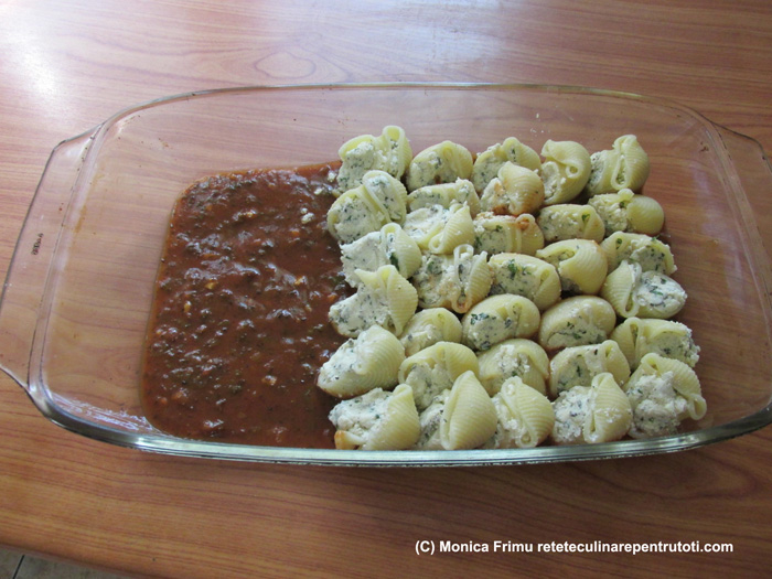 Turnăm uniform sosul și presărăm parmezan ras.