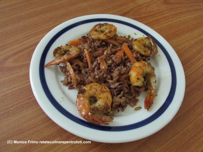 – 150 g orez roșu, 1 fir de țelină (apio) cu frunze, 1 ceapă roșie, 3 ciuperci uscate mari, 2 linguri ulei, sare, piper, 500 ml apă