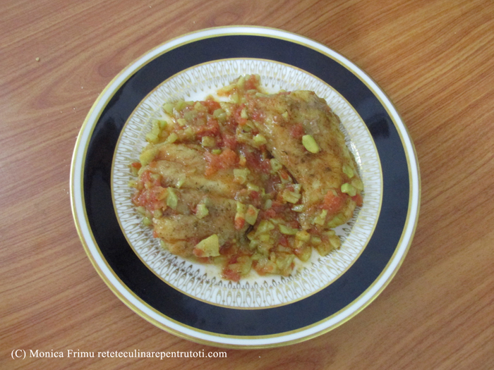 – 1 file de pangasius (250 g), 10 g frunze de mentă, 60 g roșii mici, câte ½ linguriță sare și piper alb măcinat, ulei, apă