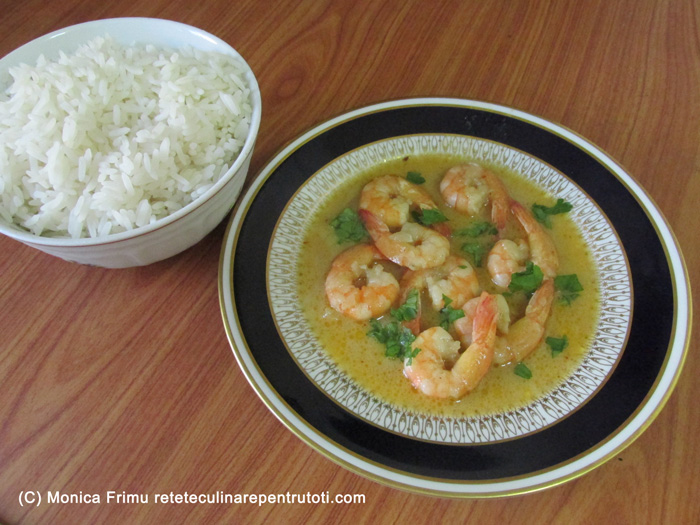 – 250 g creveți decorticați, 1 lingură pastă de curry roșie, ½ ceapă, 100 ml lapte de cocos, 1 linguriță lemongrass praf, 2 linguri ulei, 1 lingură sos de pește, 50 ml apă, pătrunjel verde