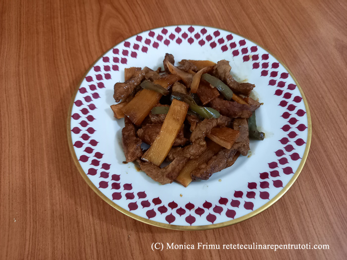 Tăiem carnea fâșii, amestecăm cu pasta de curry, zahărul, 1 lingură sos de soia, 1 lingură ulei, acoperim și ținem de o parte 30 minute. Curățăm și tăiem usturoiul și ghimbirul mărunt, ardeiul felii. Scurgem mugurii de bambus. Într-o tigaie antiaderentă încălzim 1 lingură de ulei pe foc mare, punem usturoiul, ghimbirul și amestecăm 30 secunde. Adăugăm carnea, piperul și amestecăm din când în când 10 minute. Adăugăm ardeiul, mugurii de bambus, 1 lingură sos de soia și amestecăm 2 minute. Turnăm apa, acoperim cu capac și fierbem 5 minute. Îndepărtăm capacul, presărăm praful de lemongrass, amestecăm și gătim până carnea este moale și se evaporă lichidul, aproximativ 3 minute. Porționăm și servim.