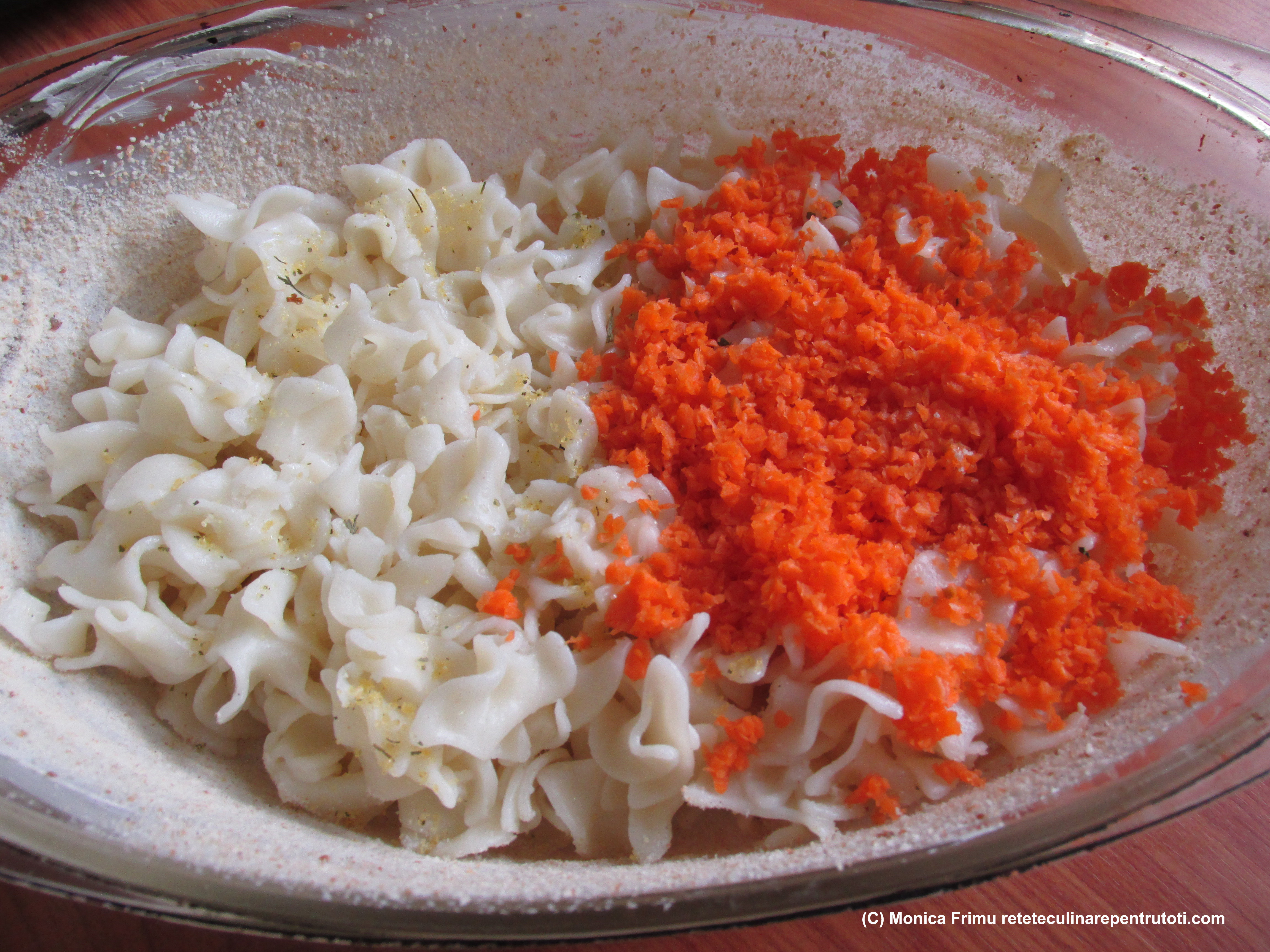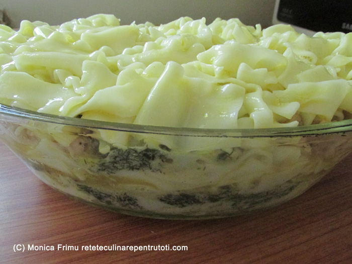 – 3 ouă, 250 g paste ondulate, 250 g frunze de spanac congelate, 300 g caș sărat, 50 g ceapă roșie de apă, 2 linguri de mărar tocat mărunt, 1 lingură semințe de in, câte ½ linguriță piper negru măcinat și sare, 2,5 l apă; pentru formă margarină și pesmet