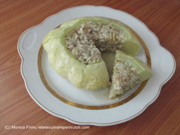Punem capacul, acoperim cu folie de aluminiu și punem în cuptorul preîncălzit la foc mediu 10 minute. Îndepărtăm folia, capacul și punem în cuptor 10 minute. Scoatem pe un platou și servim.