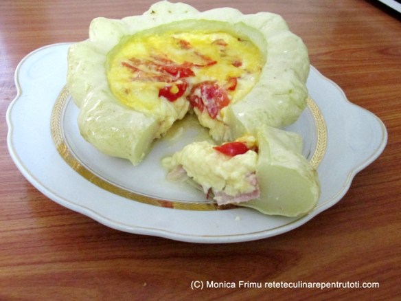 – 1 patison mare ( 600 g), 1 ou, 150 g brânză Gouda, 60 g smântână, 3 felii subțiri șuncă afumată, 1 roșie mai mică, 1 linguriță sare, ulei, apă