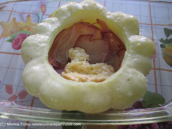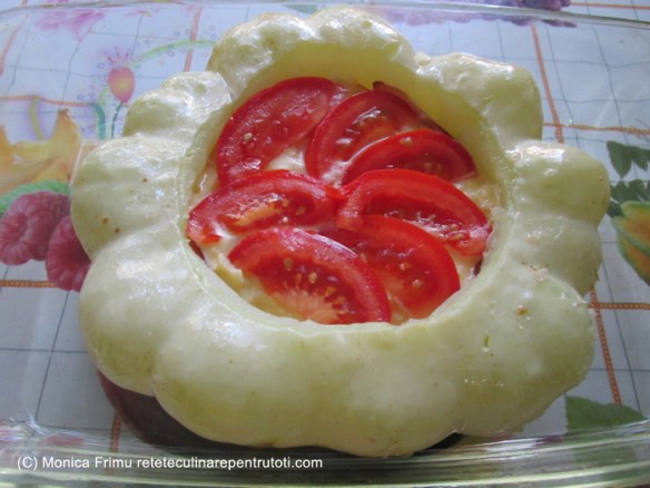 Tăiem capacul patisonului, îndepărtăm miezul și fierbem în 1,5 l apă clocotită cu sare 15 minute până începe să se înmoaie (dinții furculiței pătrund în miez). Scoatem de o parte și răcorim. Ungem la exterior cu ulei și așezăm într-un vas Yena uns cu ulei. Radem mare brânza, amestecăm cu smântâna și oul. Tăiem roșia felii subțiri. Tapetăm interiorul patisonului cu feliile de șuncă și umplem cu brânza.