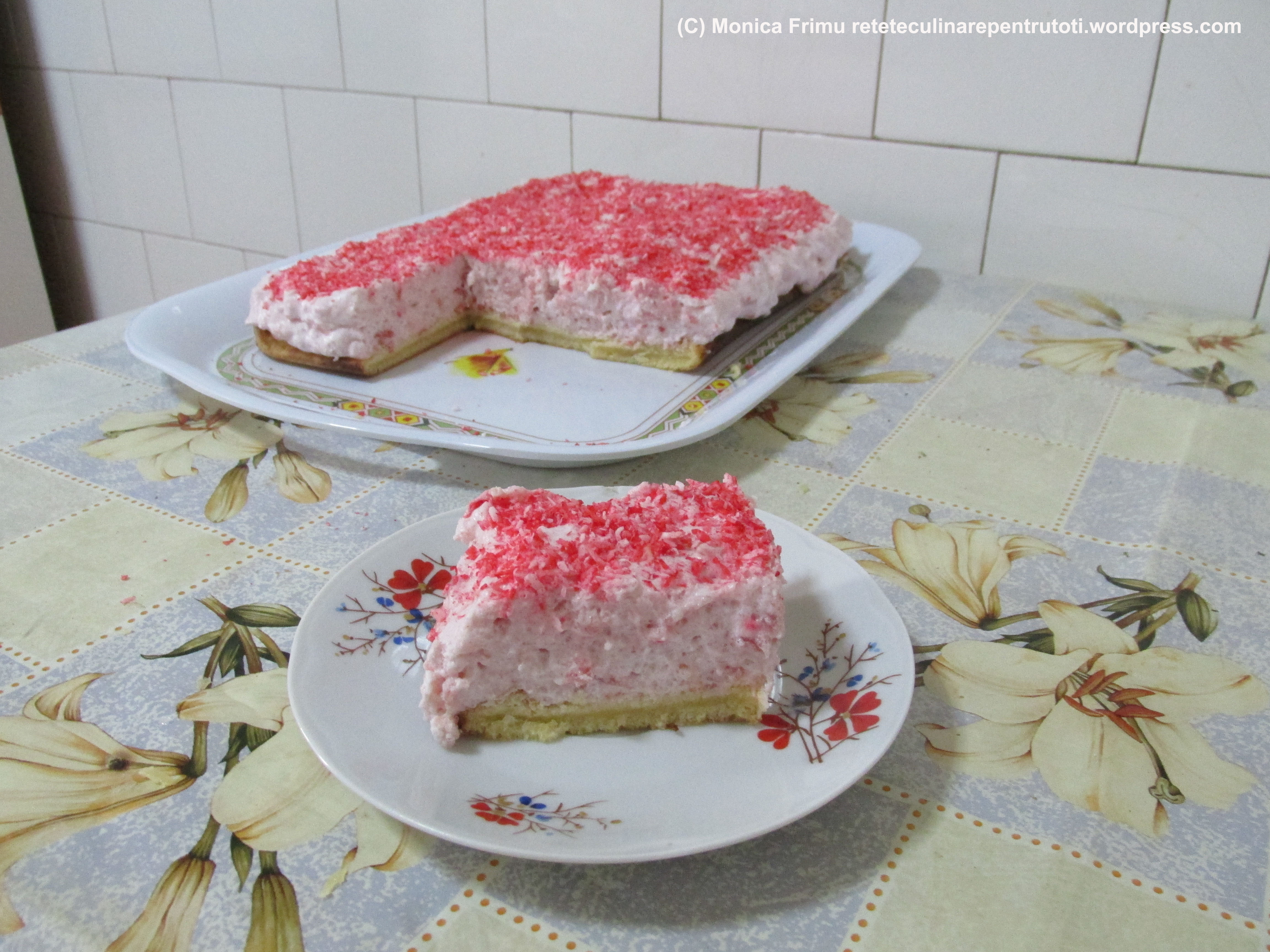 Într-o tavă tapetată cu folie alimentară punem blatul (îi tăiem capacul), peste întindem crema. Punem în frigider până a doua zi. Decorăm cu fulgi de cocos roşii. Porționăm și servim.