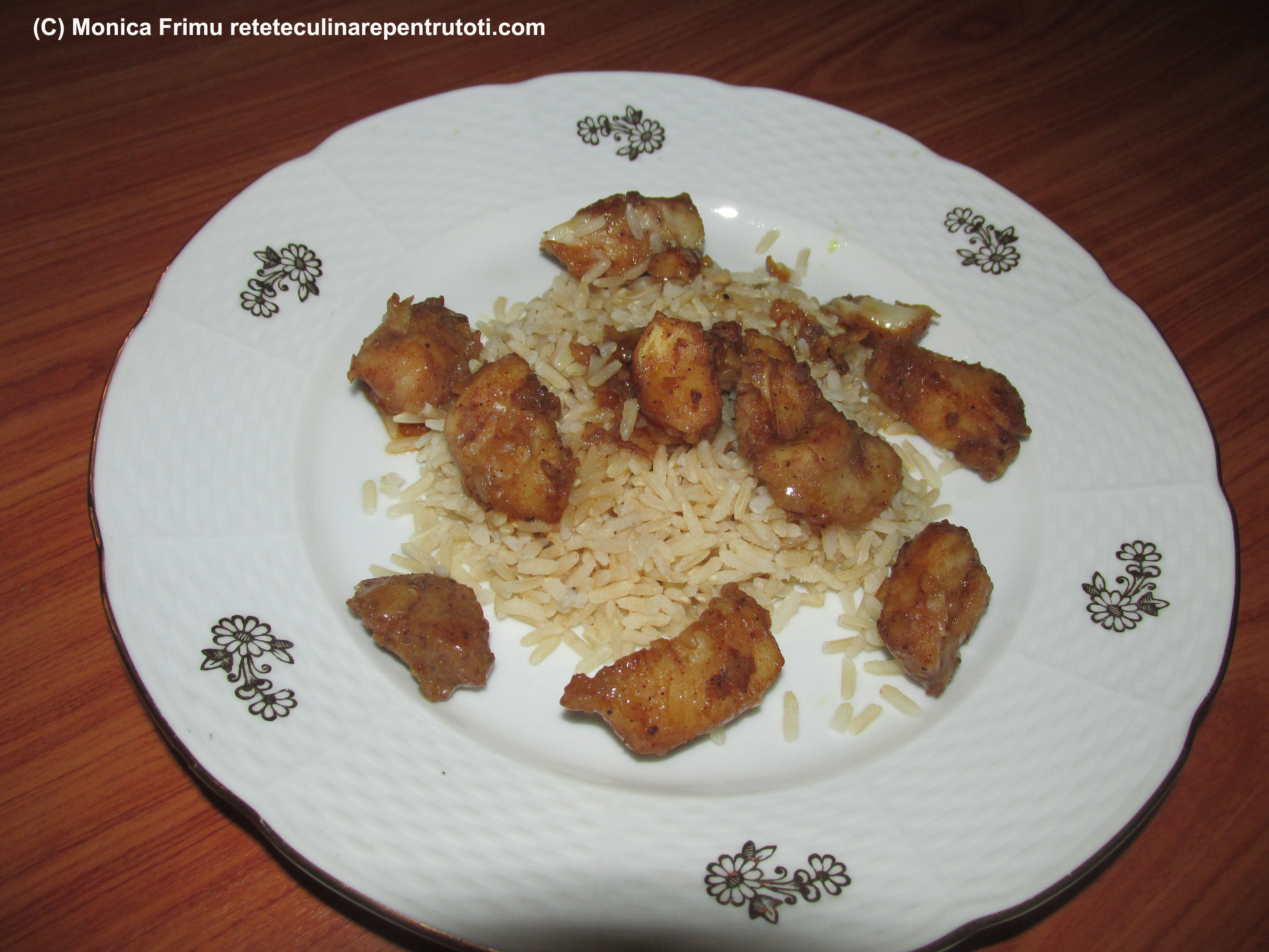 Tăiem peștele cuburi. Curățăm și tăiem ceapa mărunt, radem ghimbirul, le amestecăm cu ienibaharul, scorțișoara, zahărul și sosul de soia Punem peștele, amestecăm, acoperim și ținem în frigider câteva ore. În uleiul încins pe foc mare prăjim peștele cca. 3 minute. Servim cald cu garnitură de orez.