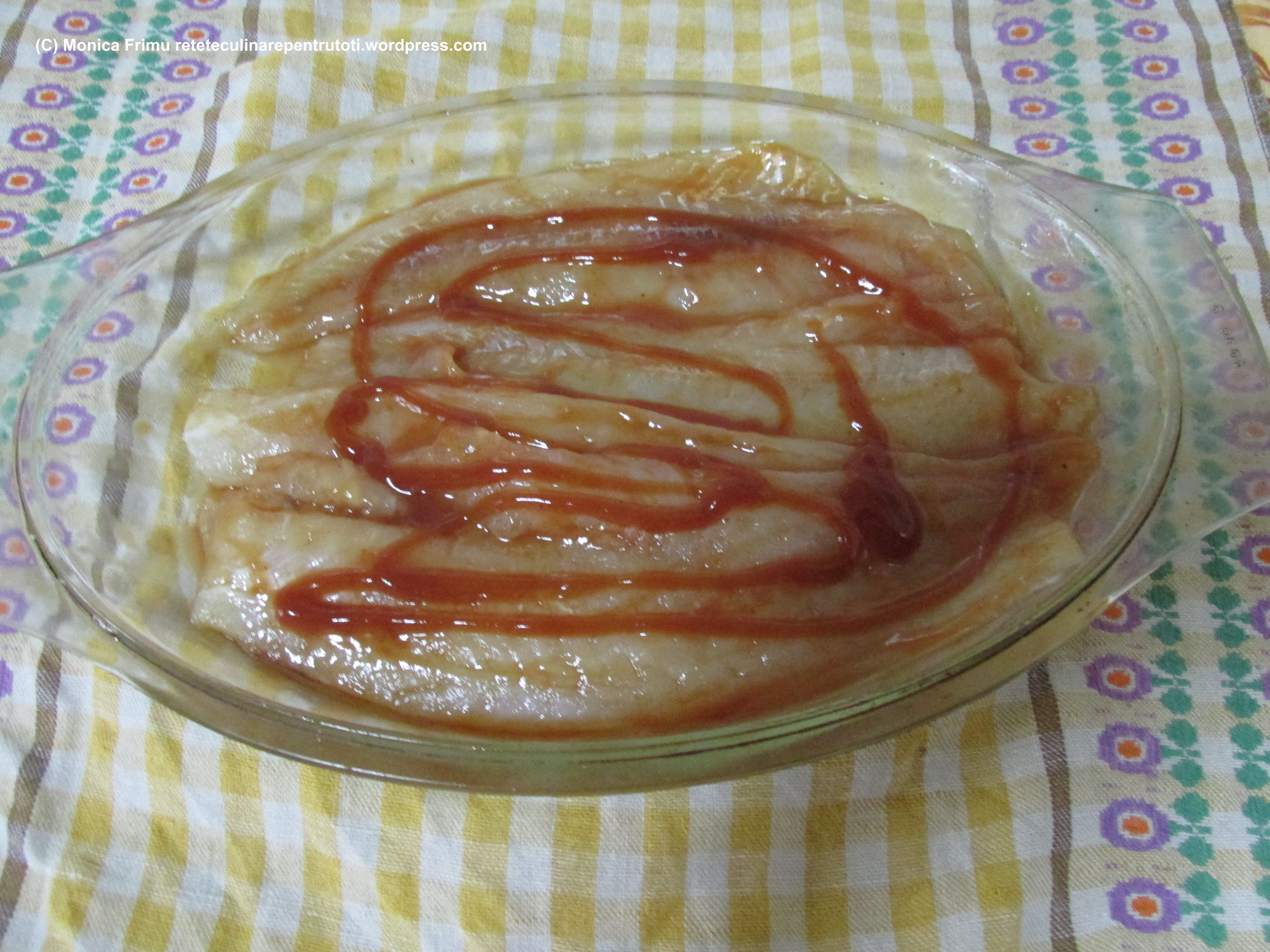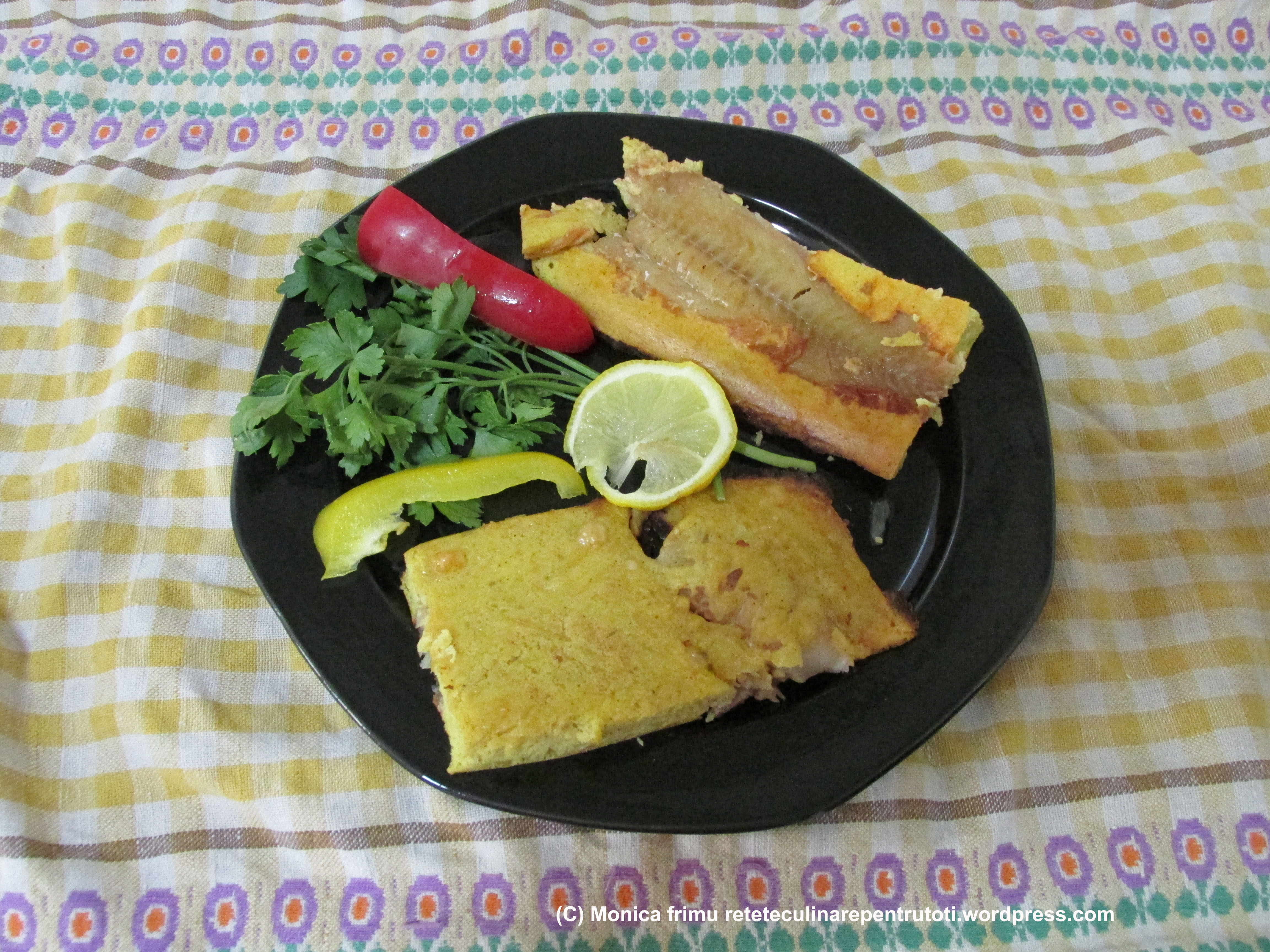 Se porţionează fileurile şi se dau printr-un amestec din rozmarin, busuioc, piper, făină. Se căleşte în 2 linguri de ulei peştele, pe ambele părţi, apoi se adaugă ardeii tăiaţi fâşii subţiri şi la sfârşit sare şi piper. Servim cu orez.
