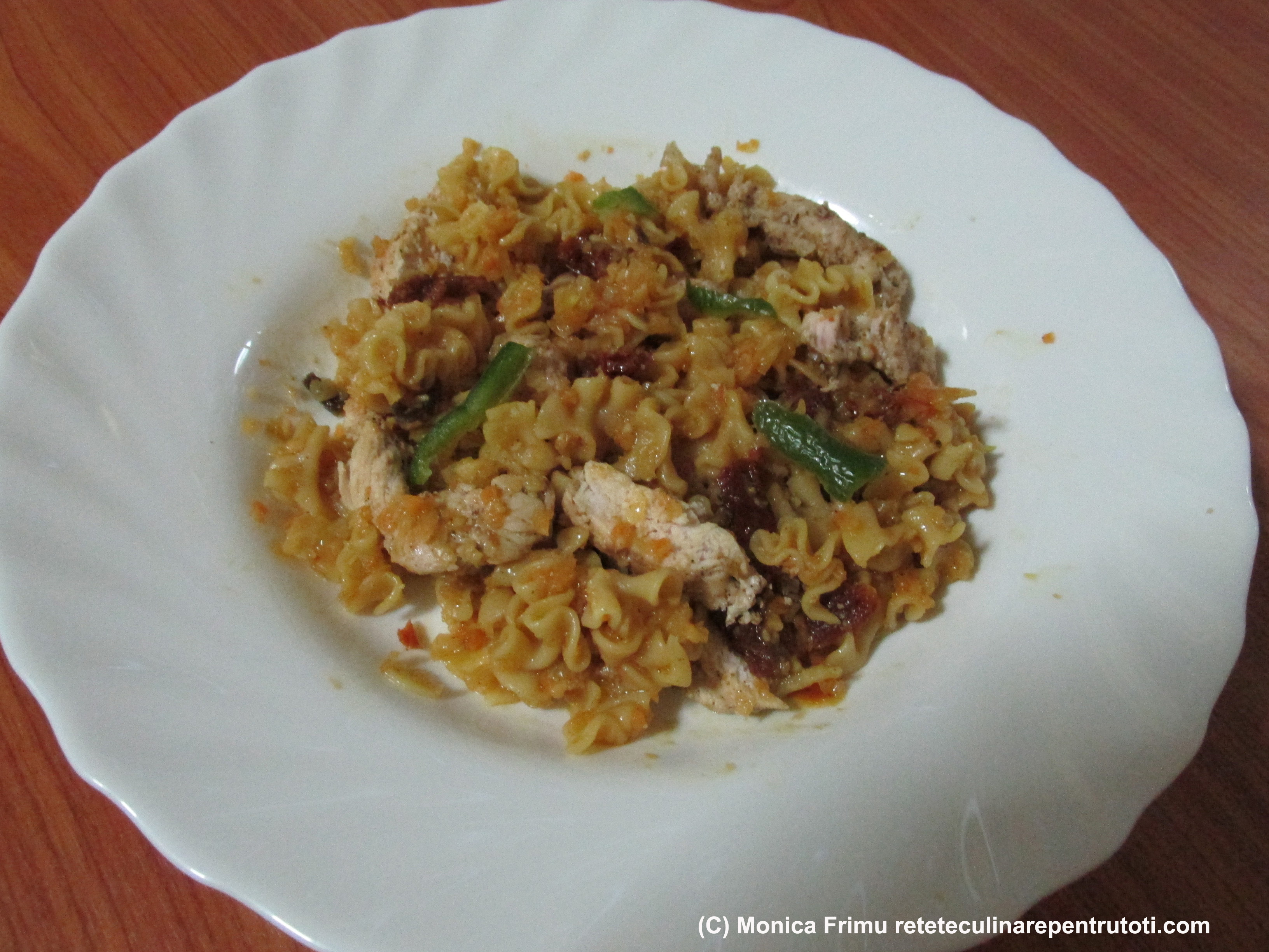 Pentru paste -200 g paste chinezeşti cu ou, 50 g praz, 150 g ţelină, 100 g morcovi, 3 roşii în ulei, 2 linguri ulei de arahide, 1 lingură praf de ceapă, 1 linguriţă piper cu usturoi, sare, apă