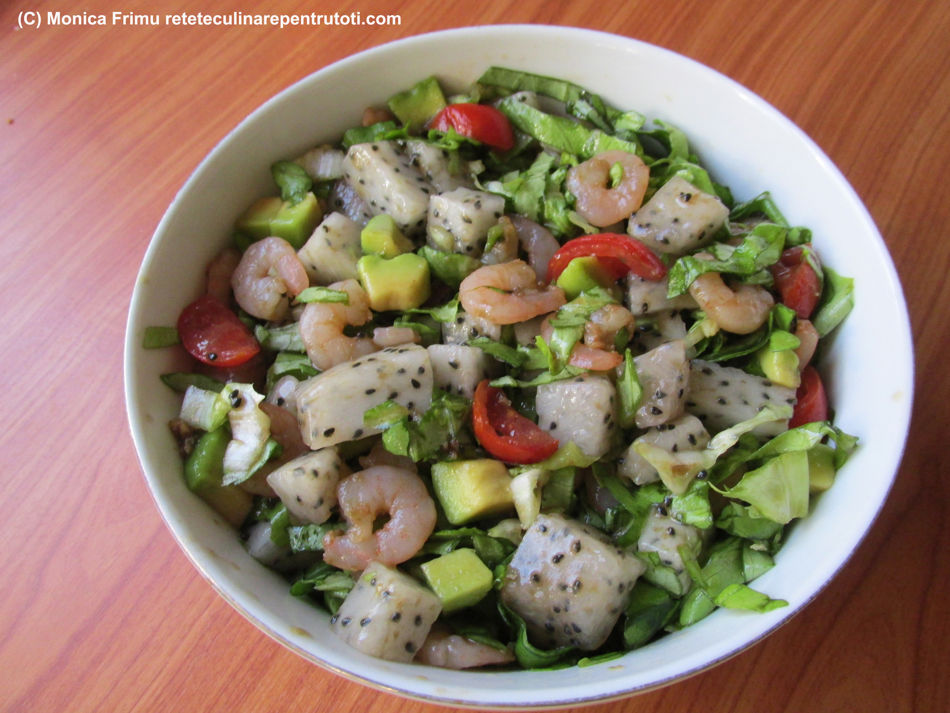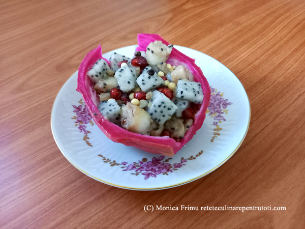 Tăiem peștele bucățele de 1-1,5 cm, turnăm 1 lingură sos de pește, amestecăm și lăsăm să stea la temperatura camerei 15 minute. Tăiem pitaya ½ pe lungime, scoatem miezul, tăiem cuburi și punem într-un bol.