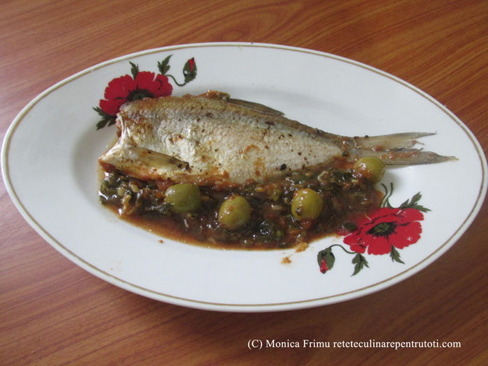 Pe peștii curățați și cu capul îndepărtat presărăm Tamouri Masala apoi îi ungem cu ulei. Curățăm ceapa, tăiem mărunt, amestecăm cu sarea, piperul, 1 lingură de ulei și bulionul. Cu compoziția obținută acoperim fundul unui vas Yena. Punem măslinele și amestecăm. Deasupra așezăm peștii. Punem în cuptorul preîncălzit la foc mai mare (200) 25 minute. Servim mâncarea caldă.