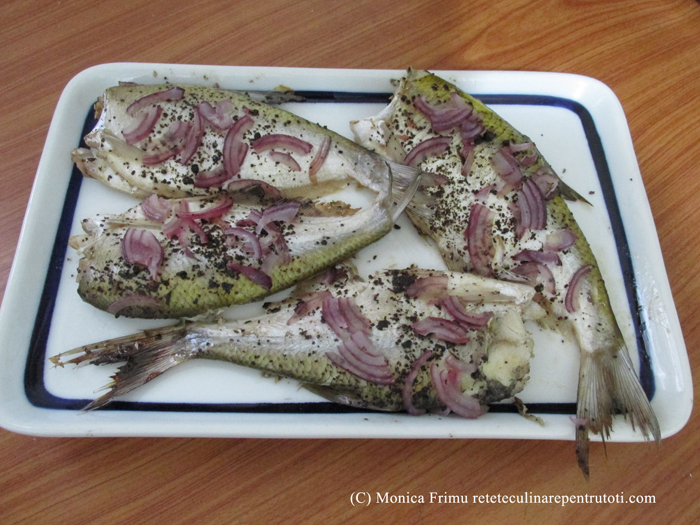 – 6 pești plătică (600 g), 2 lingurițe condimente pentru pește asiate, 100 ml vin alb demisec, 2 linguri ulei, ½ linguriță sare de mare