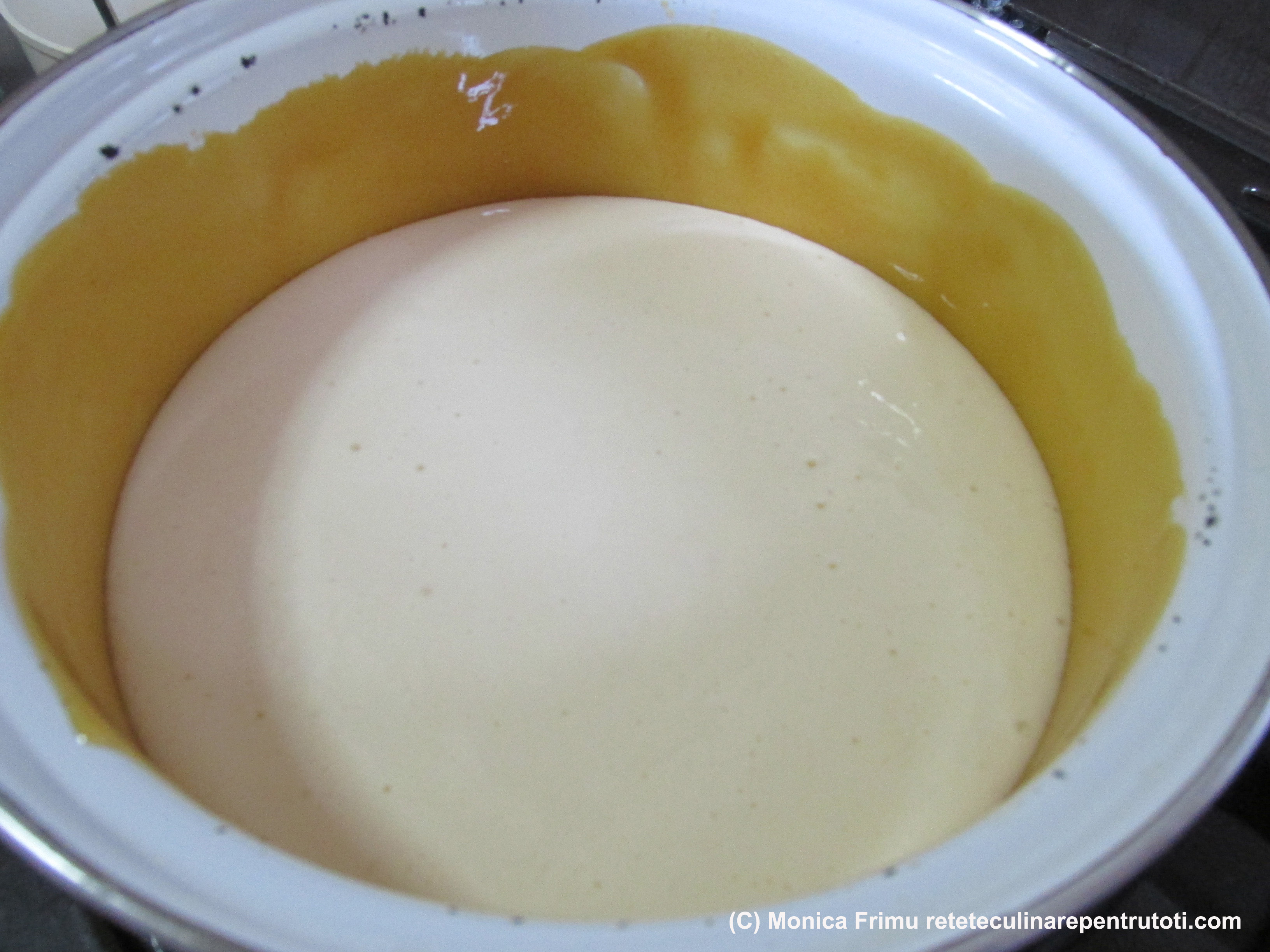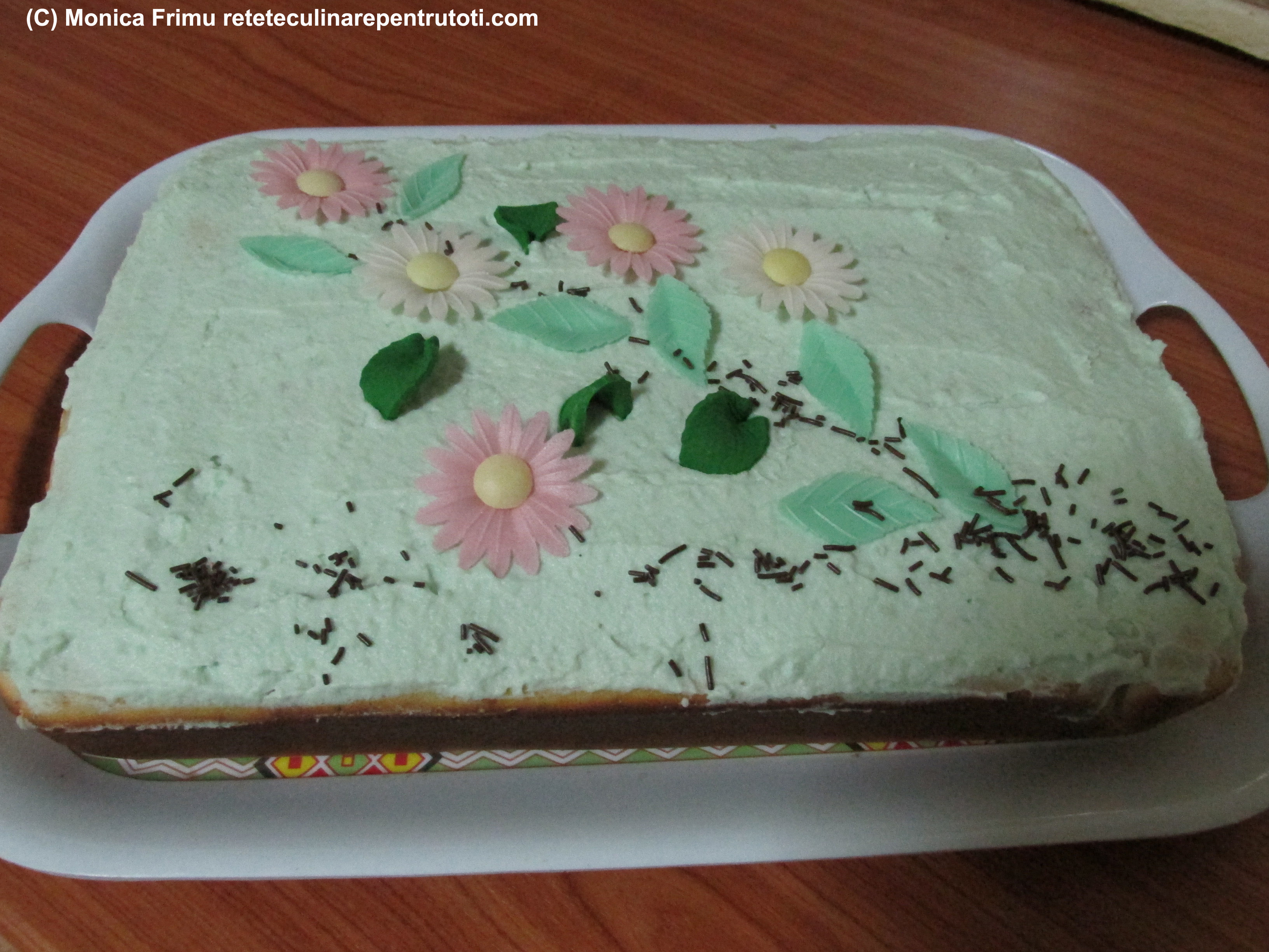 Într-o tavă tapetată cu hârtie de copt, care să o depăşească, punem blatul alb, însiropăm, peste întindem ½ din cremă.