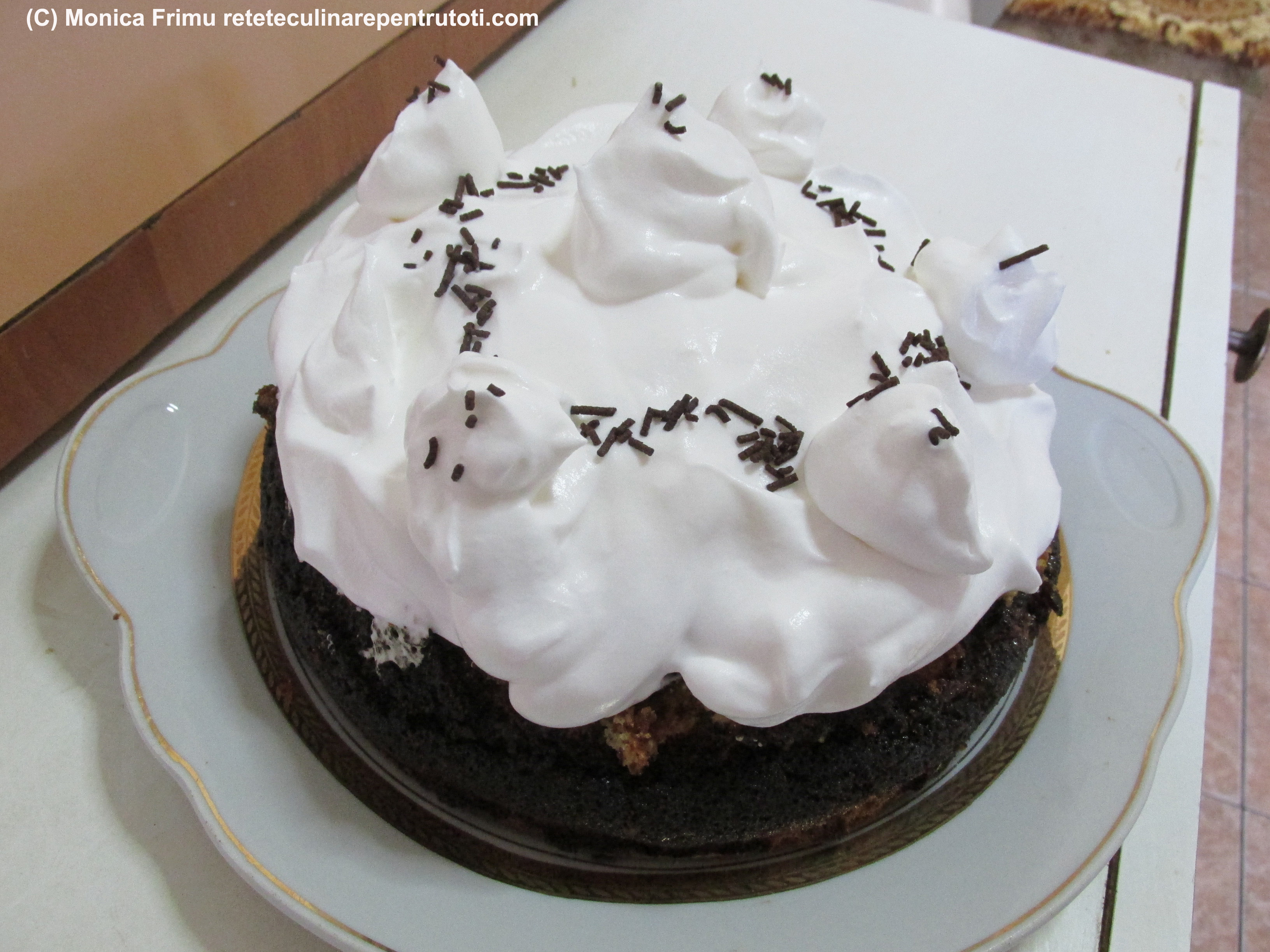Aşezăm blatul maro, însiropăm, întindem restul de cremă și acoperim cu pişcoturile.
