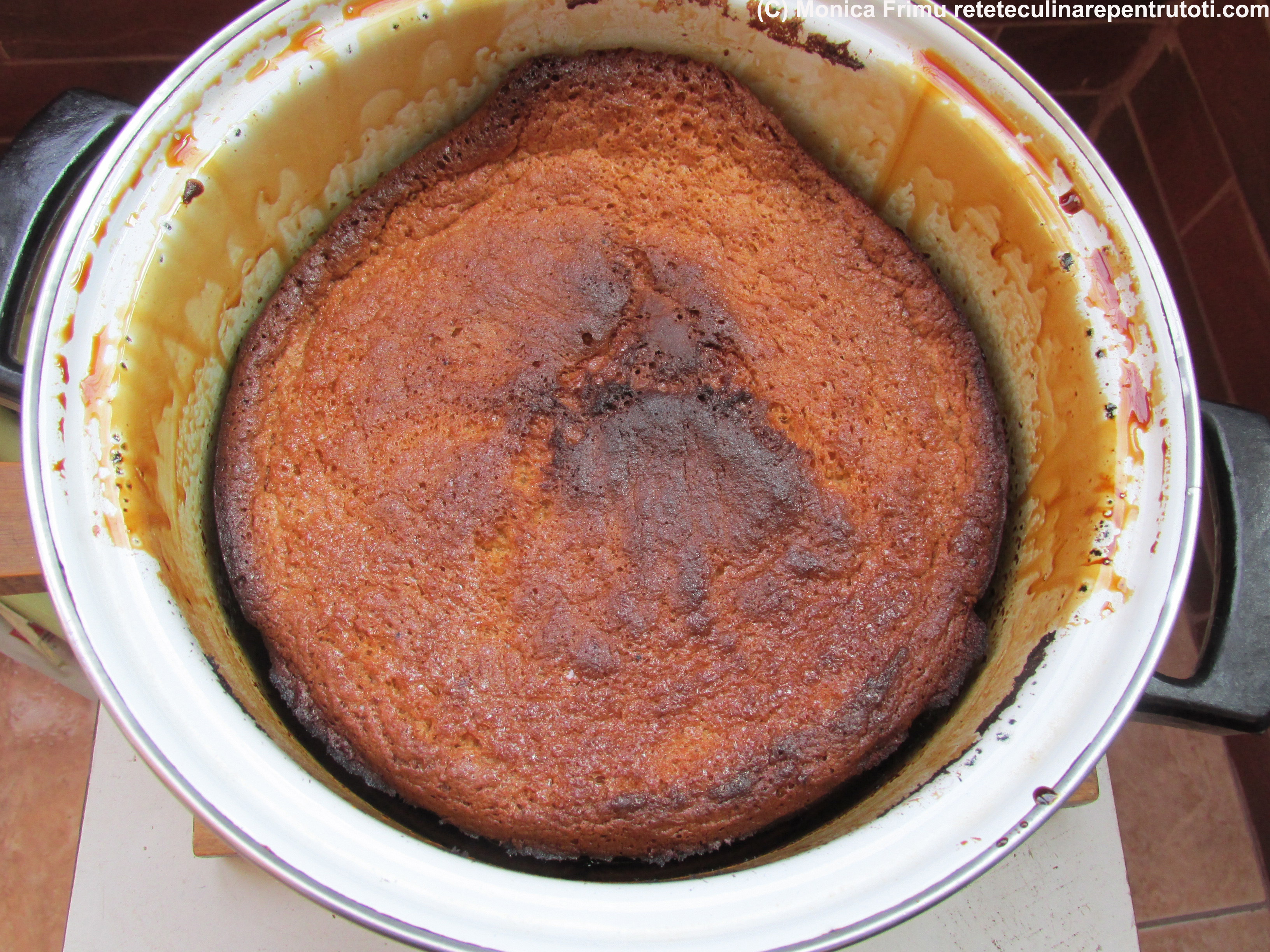 Mixăm albuşurile spumă tare cu un praf de sare, adăugăm 150 g zahăr și mixăm până devin cremoase și lucioase. Frecăm gălbenuşurile cu uleiul şi le încorporăm în bezea. Caramelizăm 100 g zahăr, stingem cu 5 linguri de apă, obţinând un sirop. Amestecăm uşor cu o paletă bezeaua cu siropul. Adăugăm făina, praful de copt şi omogenizăm. Împărţim compoziția 1/2. În jumătate amestecăm cacaoa.