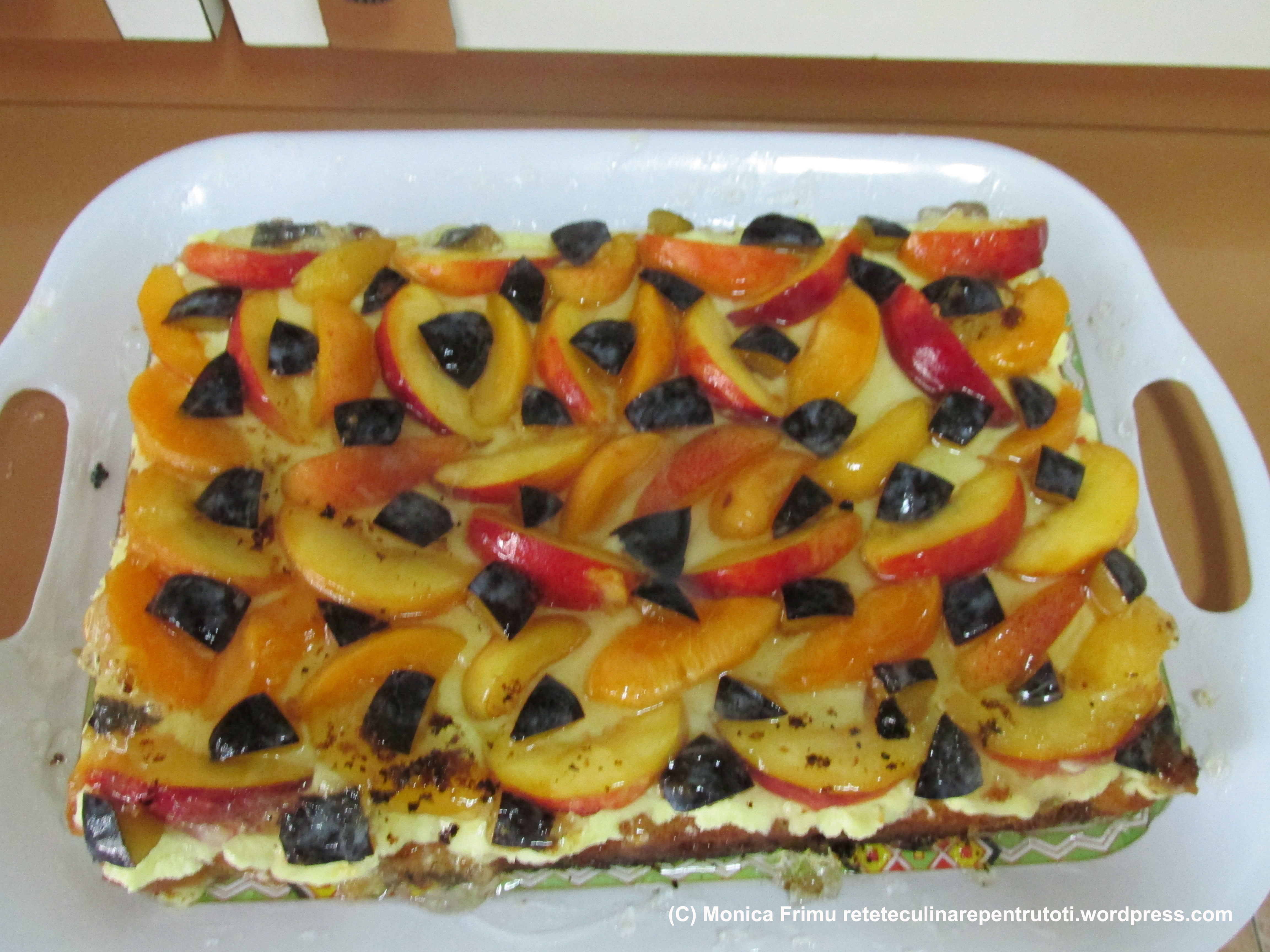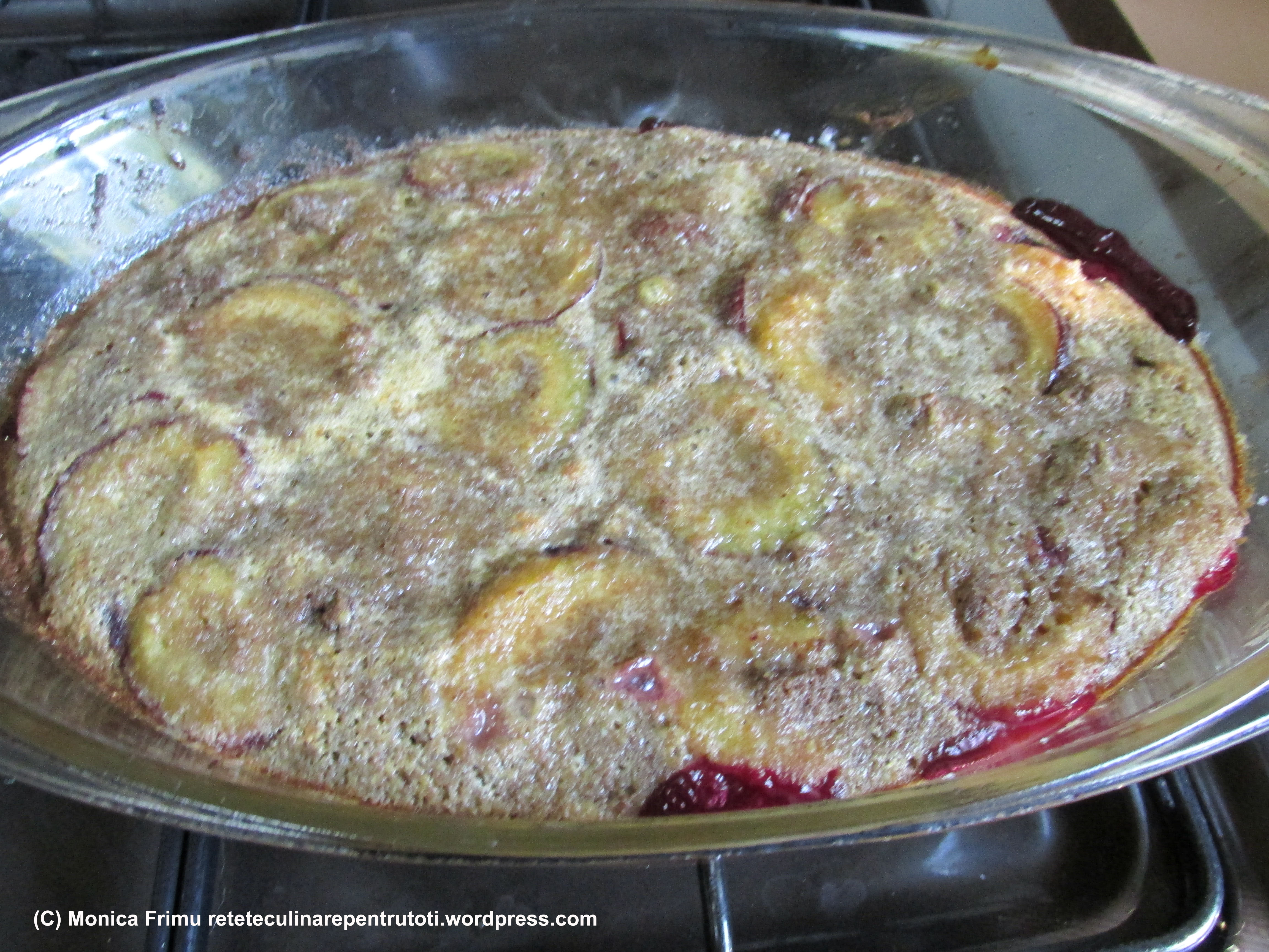 Într-un vas Yena uns cu unt turnăm ½ din compoziţie, peste așezăm prunele. Presărăm zahăr pudră şi scorţişoara, acoperim cu restul compoziției.