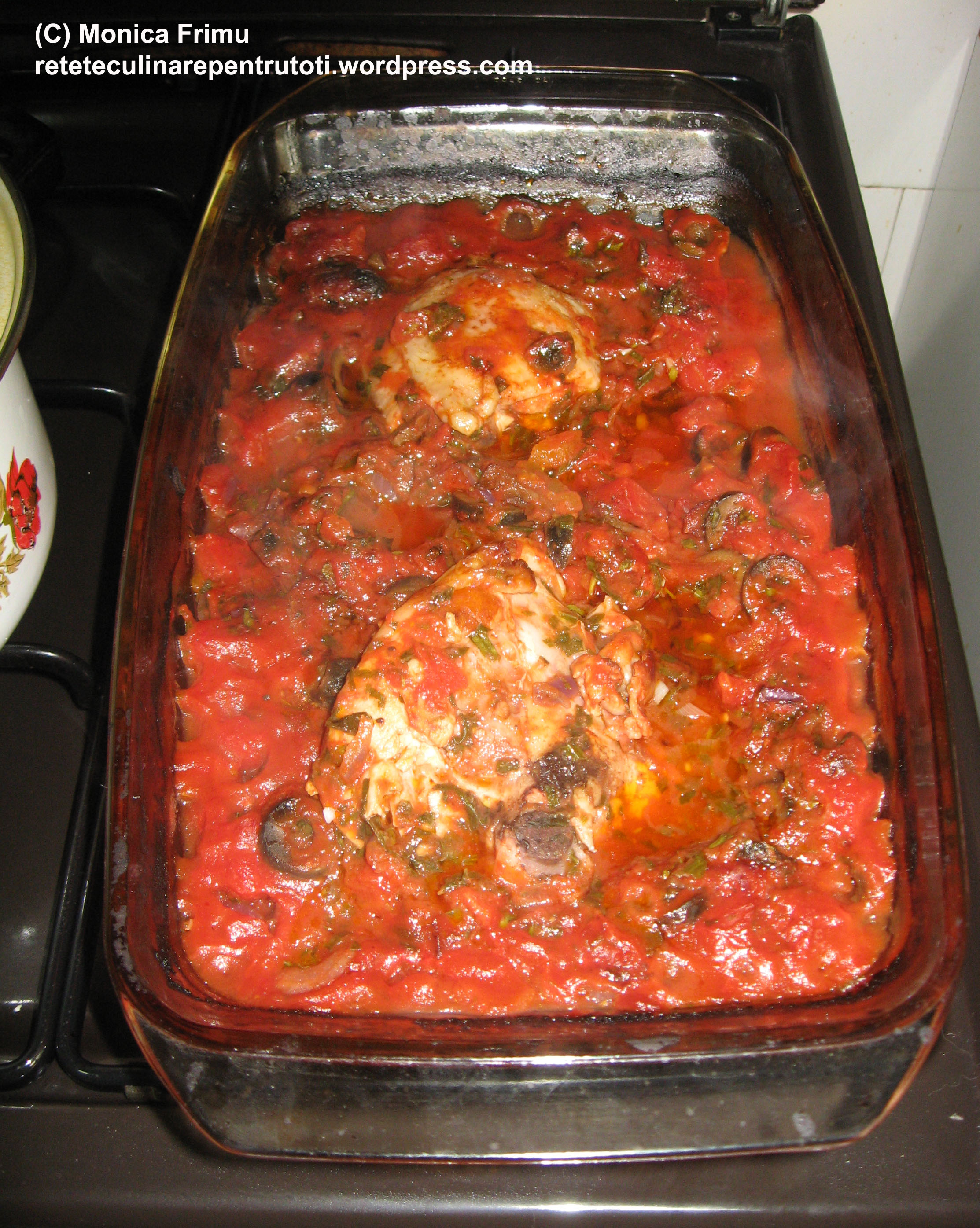4 pulpe întregi de pui, 3 căni şi jumătate (875 g) roşii decojite tăiate cubuleţe ( cu tot cu sucul din conservă), 2 cepe roşii curățate și tăiate solzi, 50 g măsline negrefără sâmburi tăiate rondele, 2 linguri frunze proaspete de tarhon, se amestecă toate, se pun într-un vas Yena, în cuptorul încins şi se coc aprox. 30 min., până se pătrunde carnea bine.