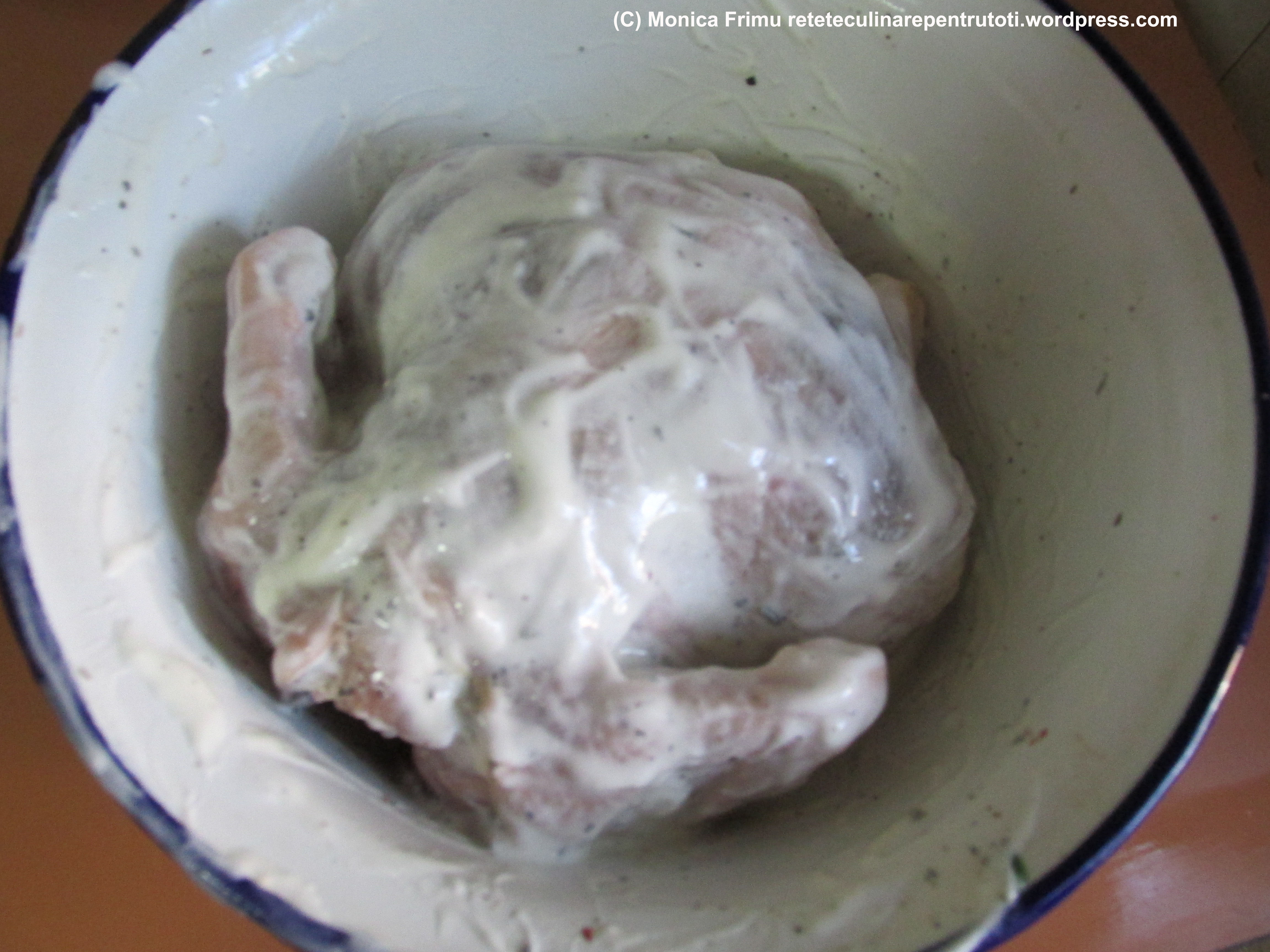 Avem nevoie de 1 pui mare (1,8 kg) pe care îl curățăm bine, sub piele introducem frunze de mentă şi salvie, îl tăvălim în 500 g iaurt, acoperim și punem în frigider până a doua zi.