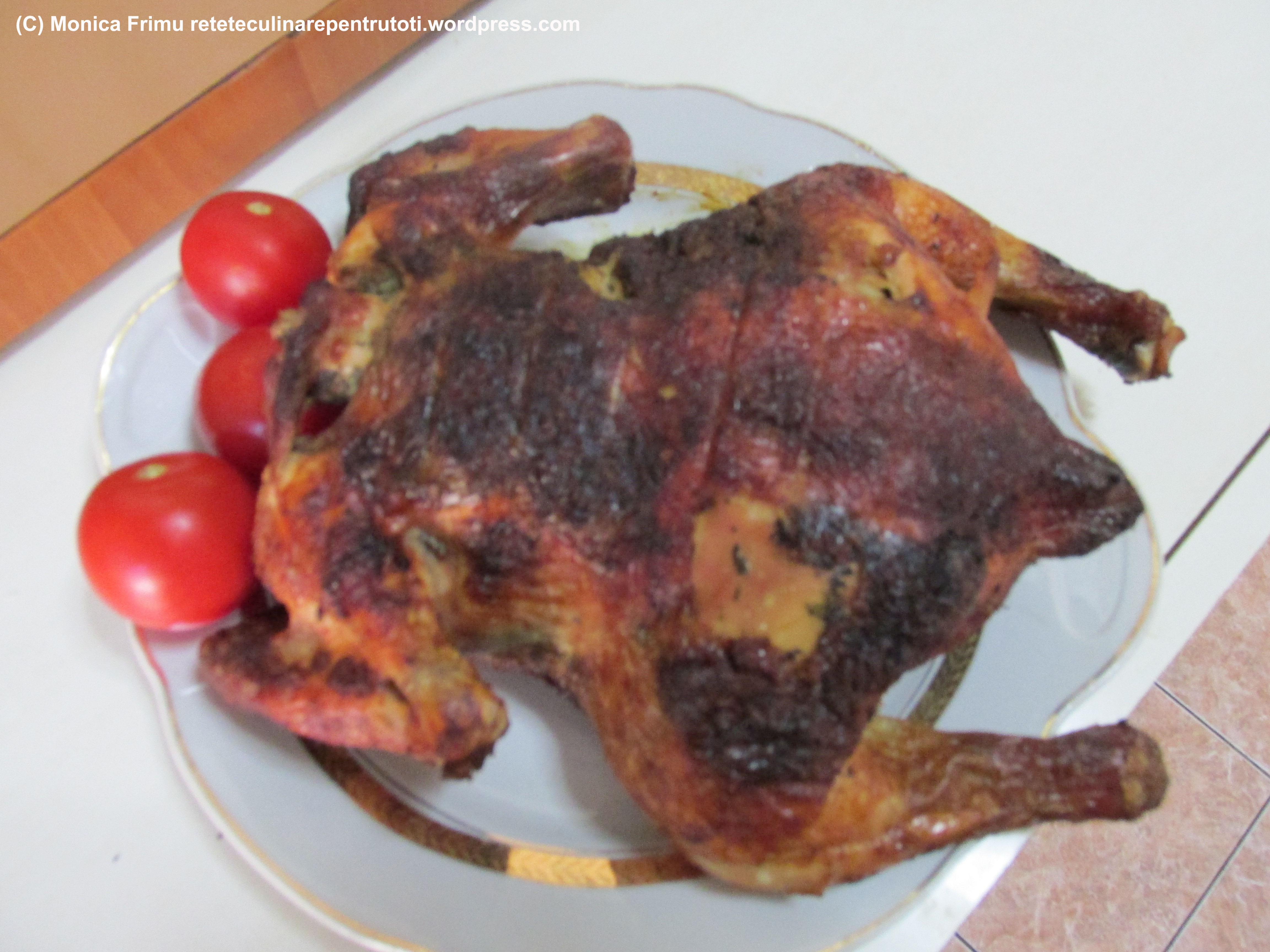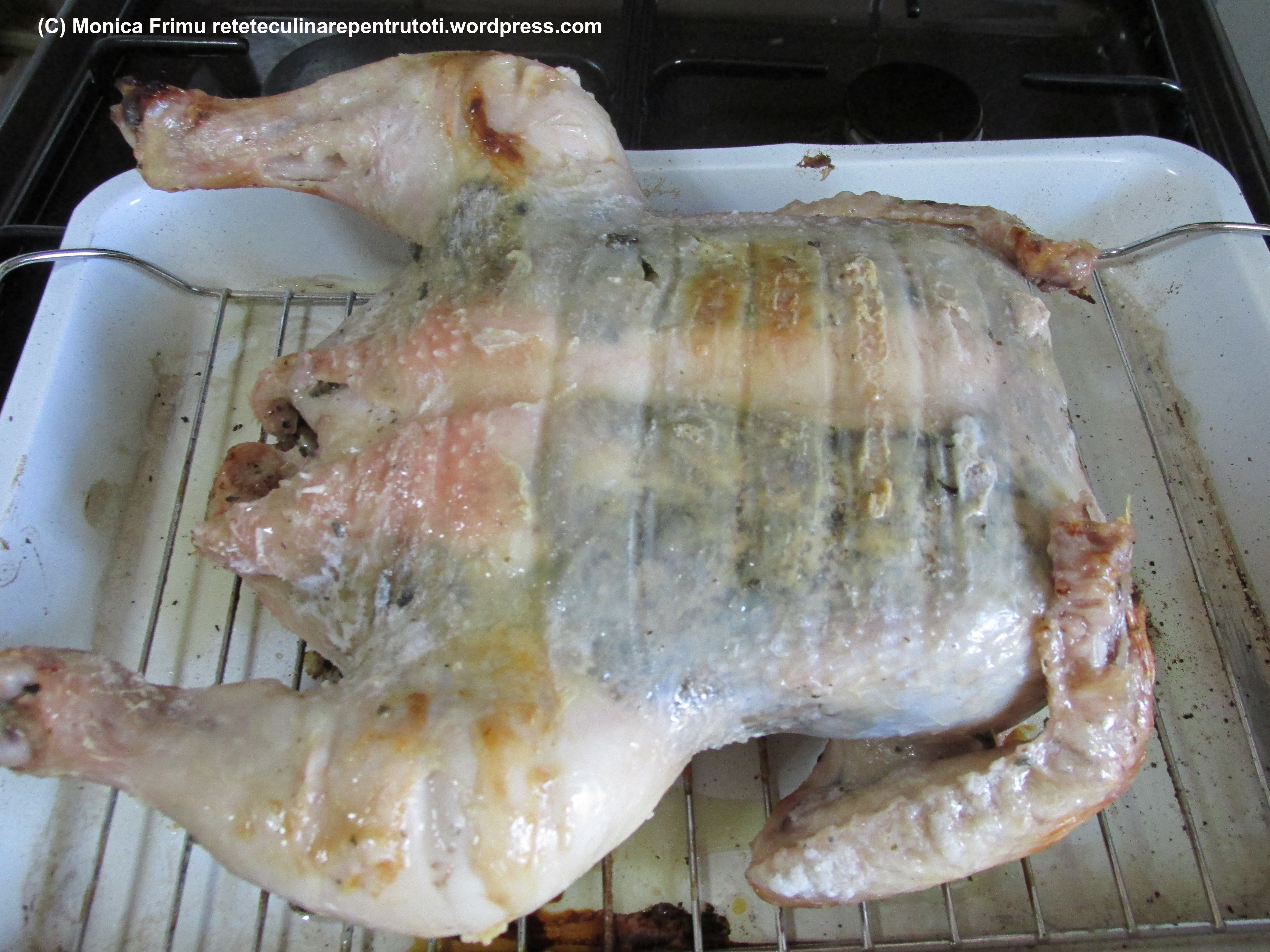 Punem în cuptor, 15 min. la foc mare, apoi foc mediu, în total aprox. 1 oră. La jumătatea timpului îl întoarcem pe cealaltă parte.