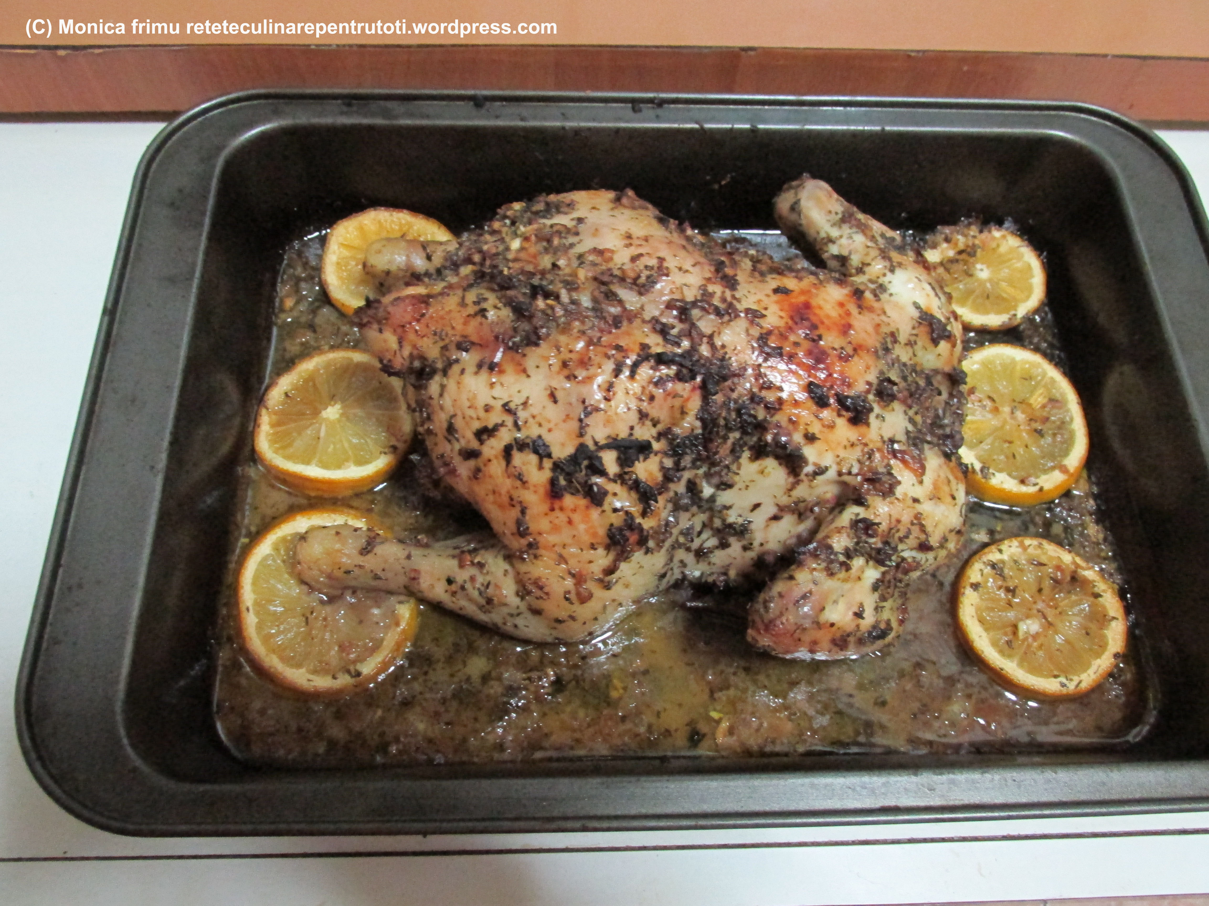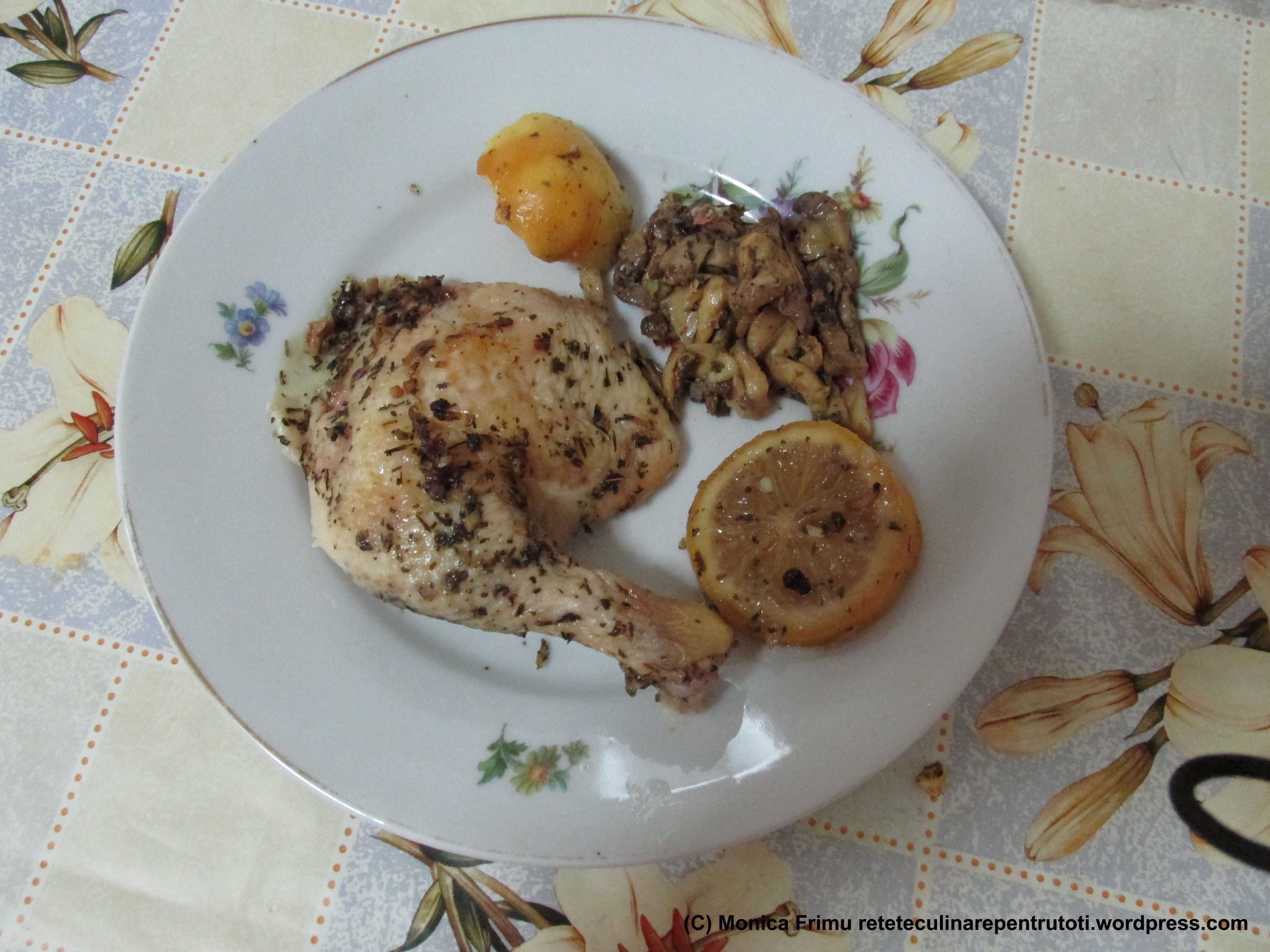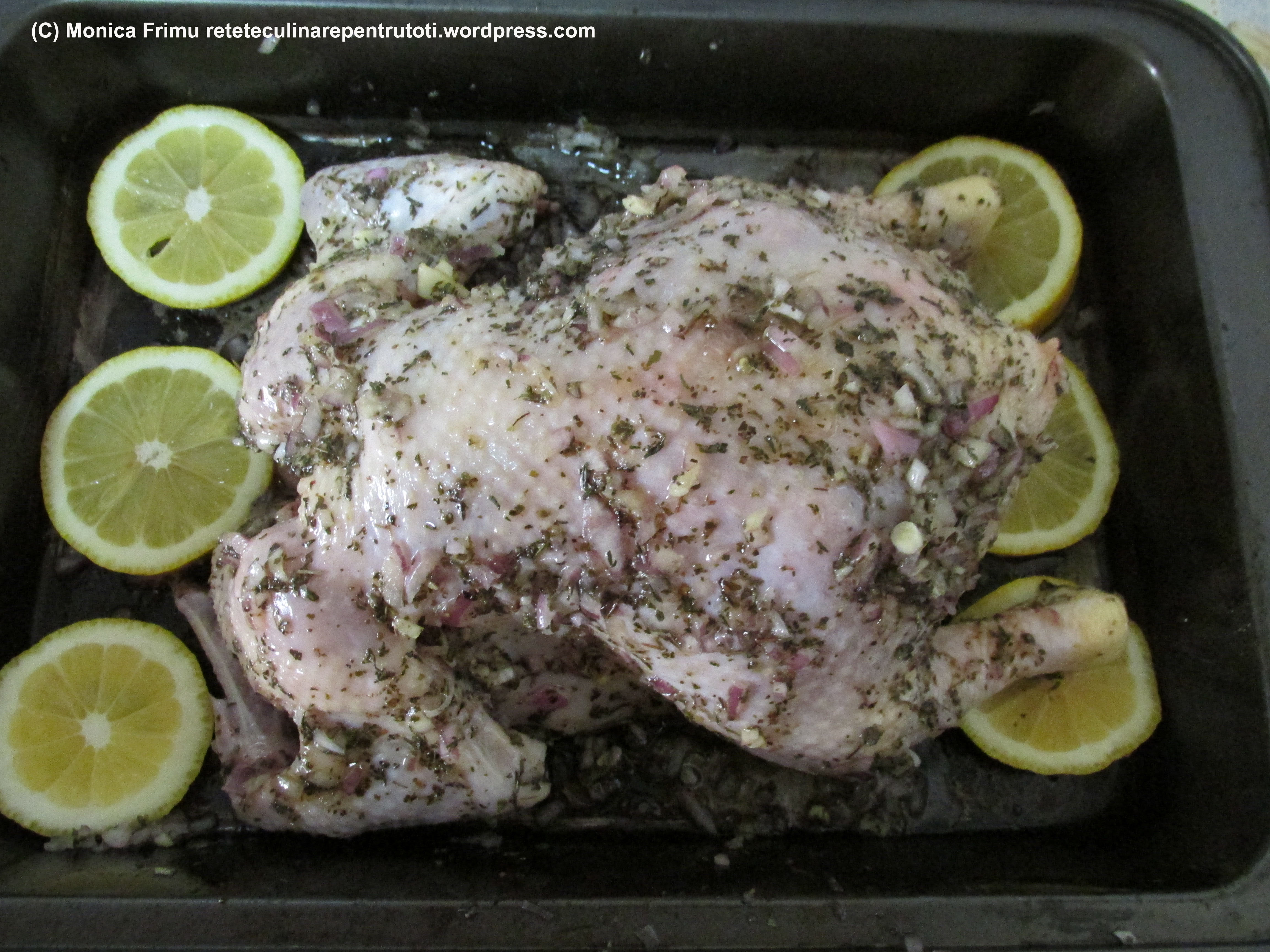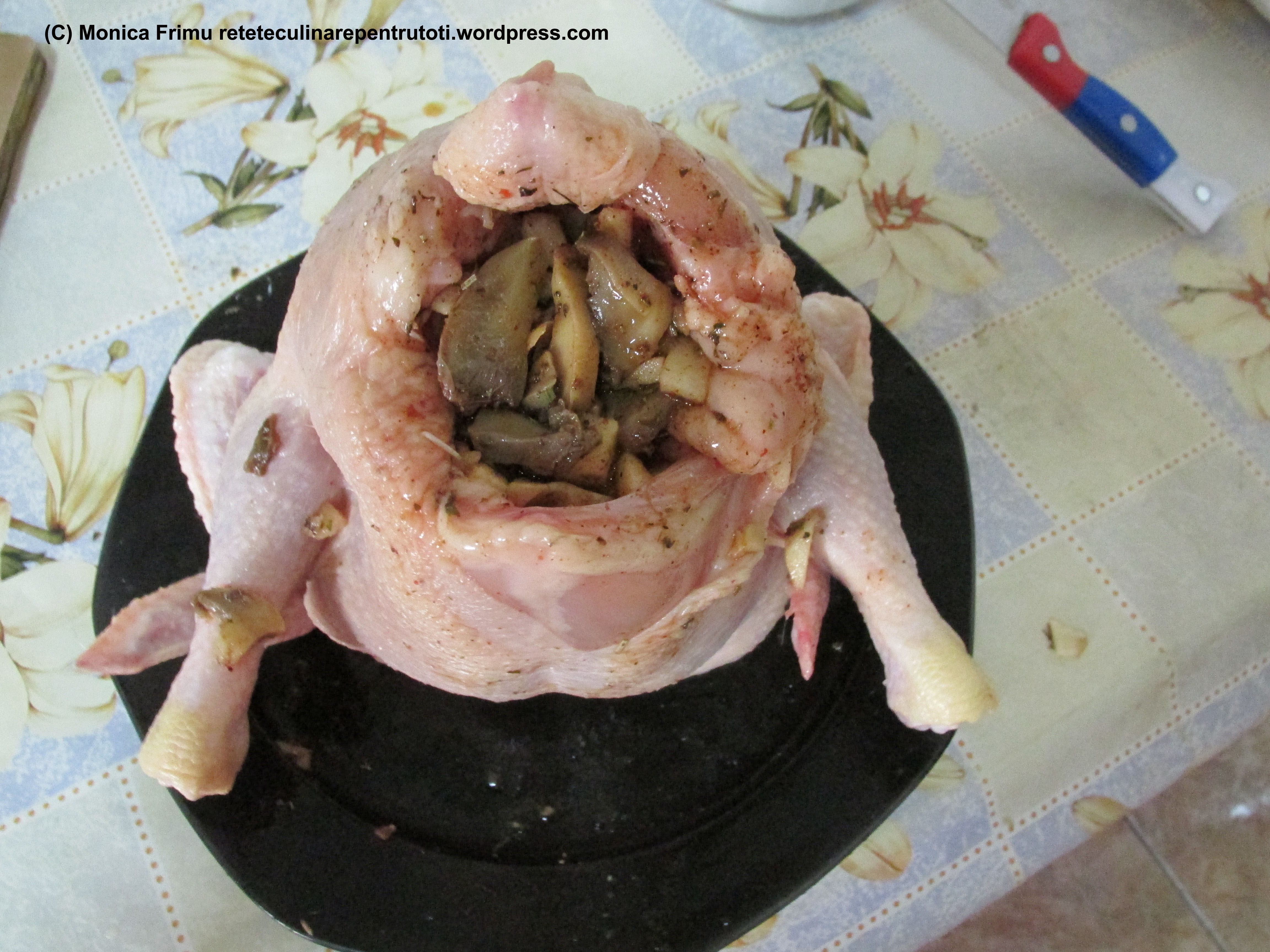MARINADA: 2 linguri ulei de măsline+4 căţei de usturoi tocaţi mărunt+1 ceapă roşie tocată fin+1 linguriţă de cimbru uscat+1 linguriţă de oregano uscat- se lasă 10 min. apoi se toarnă peste pui şi lângă el se pun felii de la 1 lămâie; se ţine la rece 20 min., se scoate, apoi dăm în interior cu condimente pt. pui, îl umplem cu un amestec dintr-o conservă de ciuperci tăiate, scurse şi 1 măr tăiat bucăţele. La extremităţi introducem câte o jumătate de măr curăţat de sâmburi, turnăm peste 200 ml de vin alb. Se pune în cuptorul preîncălzit aprox. 40 min. până e moale carnea.