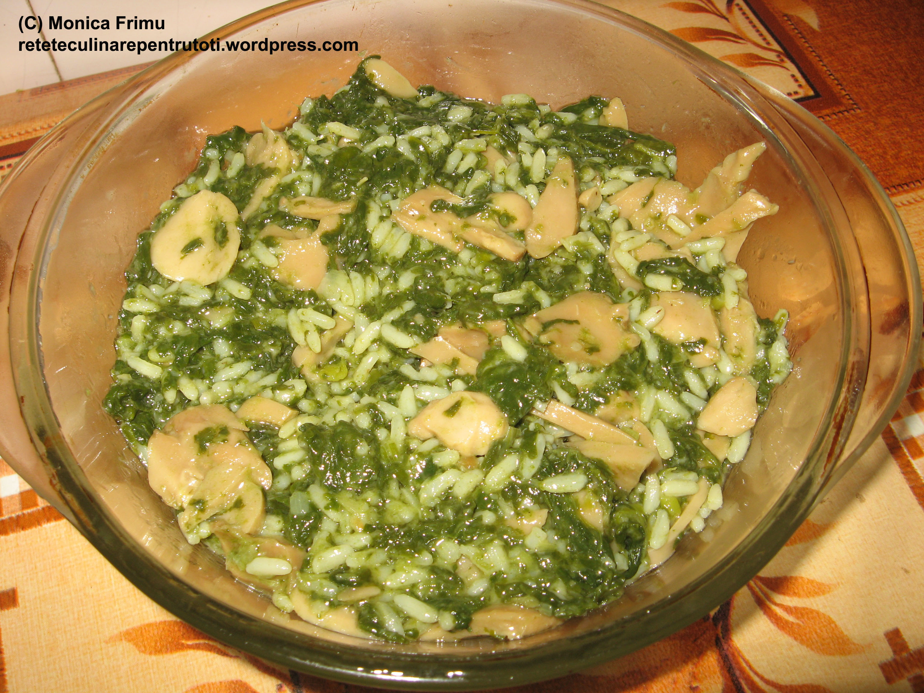 Se fierbe orezul. Se căleşte ceapa tocată (fără cozi) în ulei şi se amestecă cu orezul.