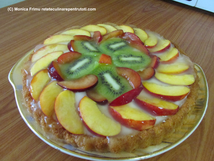 Când blatul s-a răcit îl așezăm pe un platou și însiropăm. Întindem crema uniform. Acoperim cu felii de fructe. Preparăm gelatina și o întindem peste fructe. Punem în frigider până se întărește gelatina.