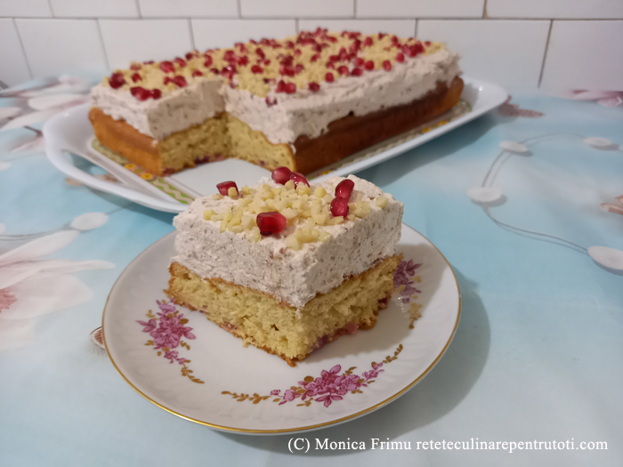 – 4 ouă, 150 g zahăr, 1 plic zahăr vanilat, 180 g făină, 1 plic praf de copt, 30 g pesmet fin, 1 linguriță praf de ghimbir cu portocale, 1 rodie, 50 g nuci, 3 linguri ulei, sare; margarină și pesmet pentru formă