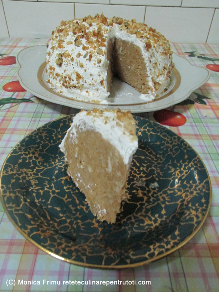 Preparăm blatul de bezea. Înmuiem stafidele în rom și scurgem. Batem tare albușurile cu un praf de sare, adăugăm zahărul și mixăm până se întăresc și devin lucioase. Încorporăm făina, amestecând ușor cu o lingură, apoi stafidele și nucile. Întindem uniform în aceeași formă de tort tapetată cu hârtie de copt. Punem în cuptorul preîncălzit la foc mediu (180) aprox. 25 min., scoatem și răcim.