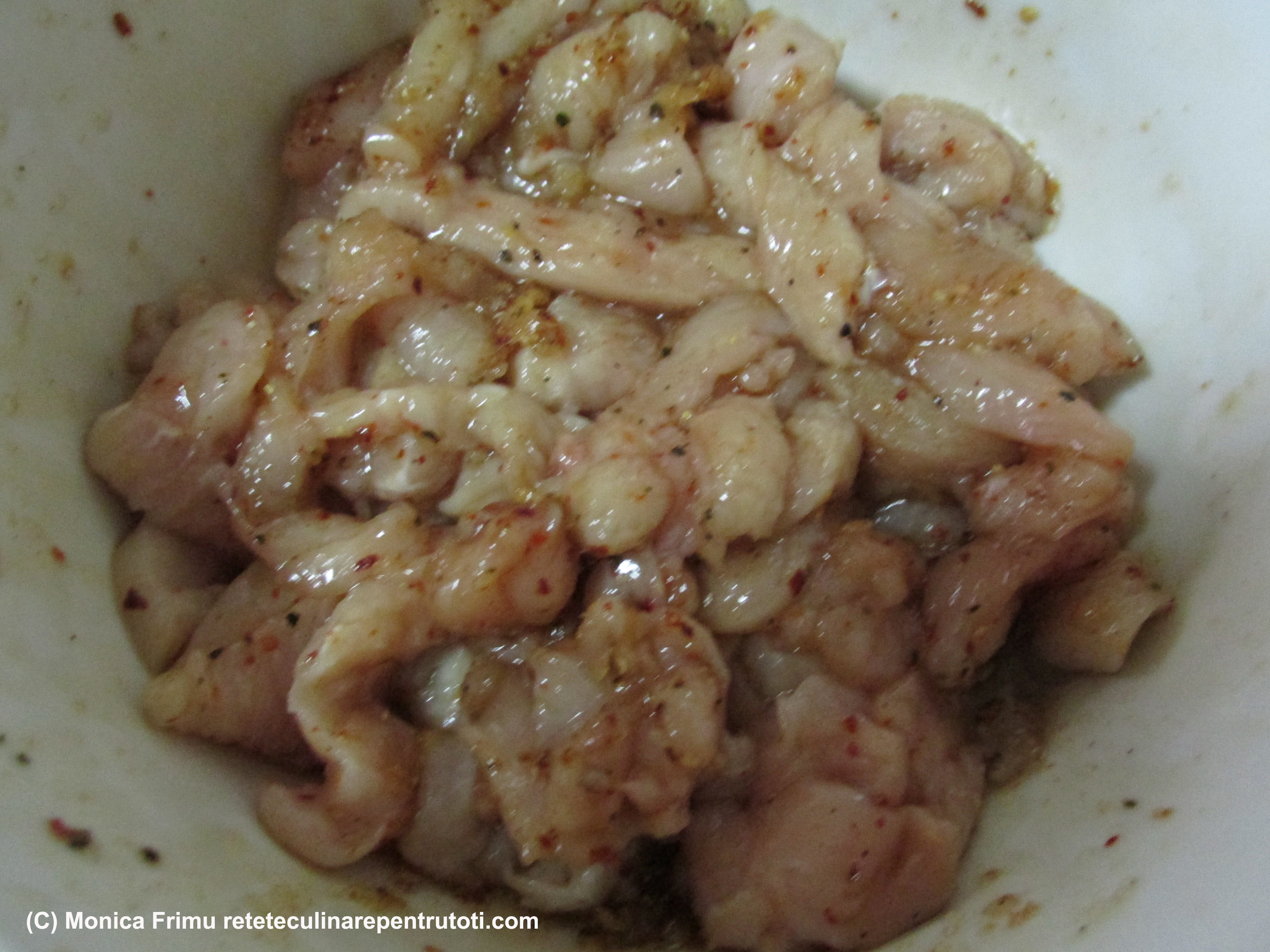 Tăiem carnea fâşii subţiri, o „tăvălim” în marinadă şi o lăsăm să stea 30 min.