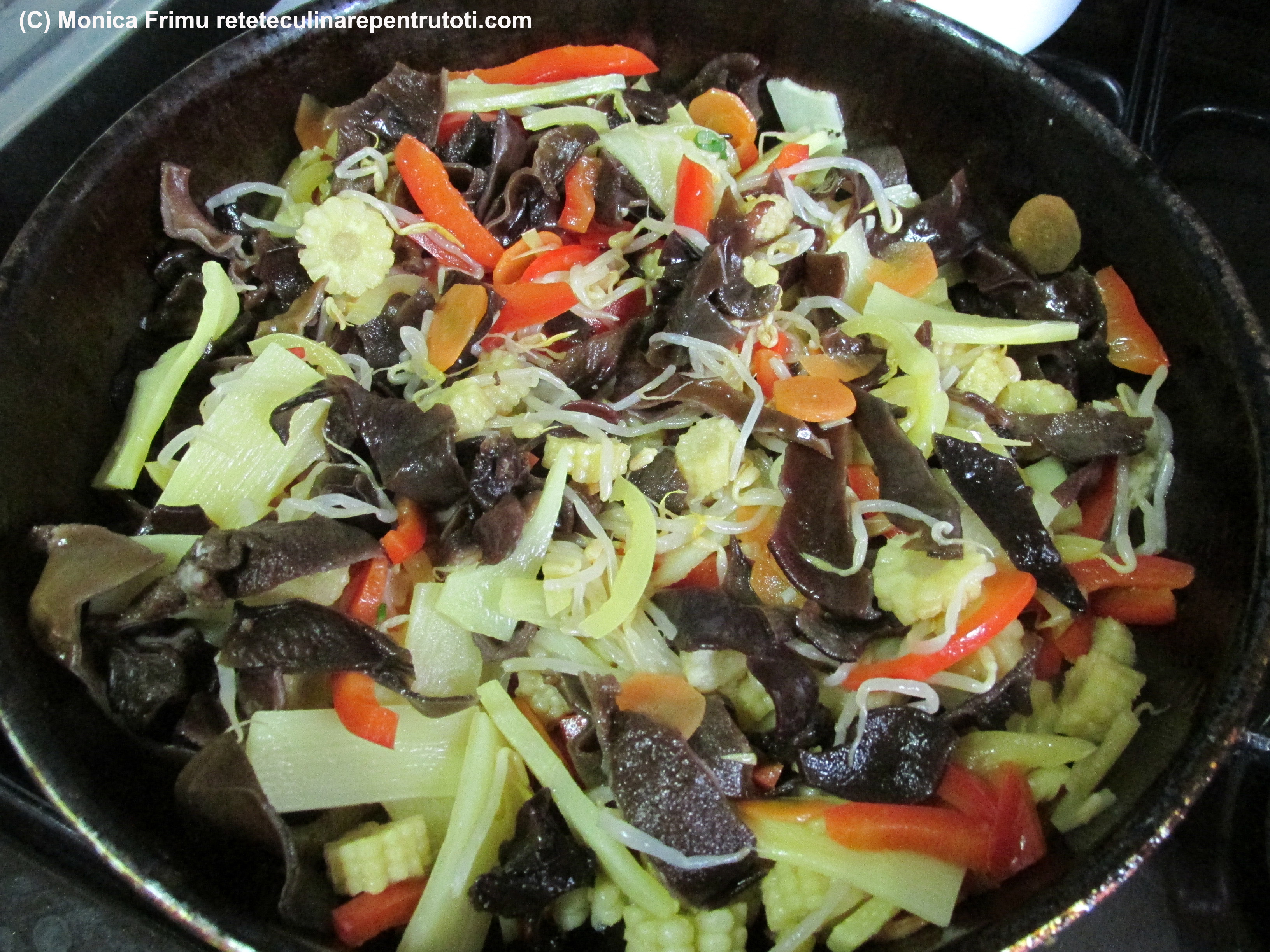 În 2 linguri de ulei încins călim morcovul şi ardeii, adăugăm porumbul, bambus, muguri de soia şi ciuperci, amestecăm 2 min. şi stingem focul.