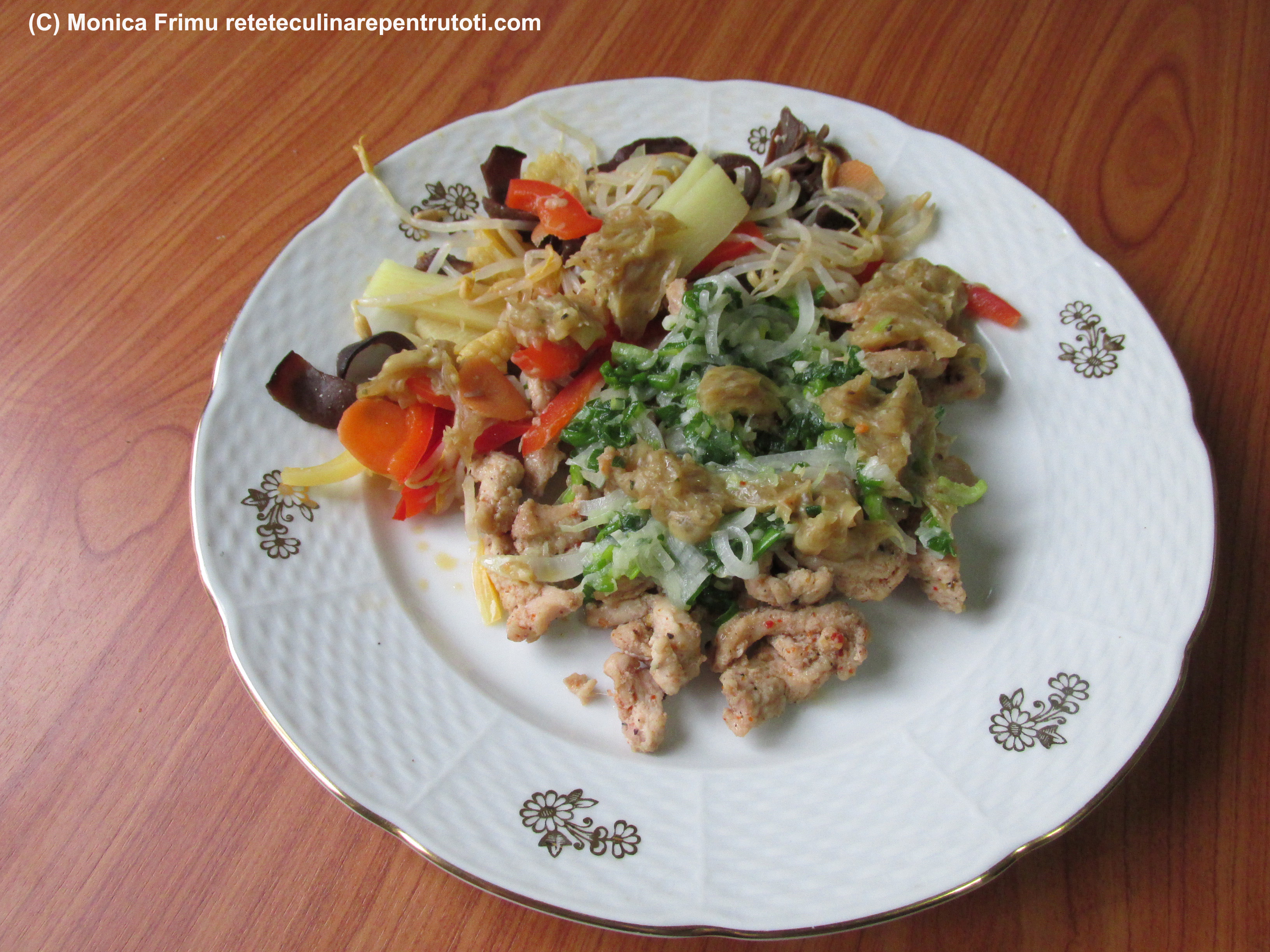 Pentru sos Hoisin (dacă nu găsiţi în magazin) amestecăm 4 linguri sos de soia cu 2 linguri unt de arahide, 1 lingură de miere, 2 linguri oţet de orez, 1/2 căţel de usturoi tocat, 2 linguri ulei de susan, 1 praf de piper, 20 pic.de sos iute.
