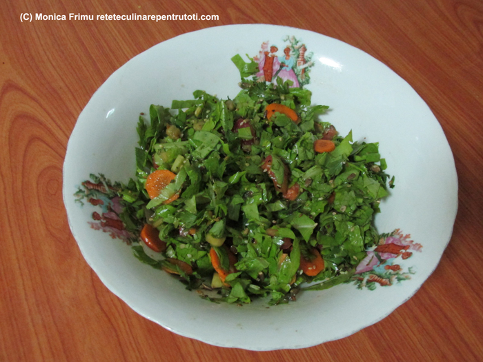 – 1 salată verde, 1 morcov (100 g), 1 roșie mare (300 g), 1 leg. pătrunjel verde, 1 lingură susan, 2 linguri semințe de armurariu, 1 lingură ulei de susan, sare, 3-4 linguri sos de busuioc
