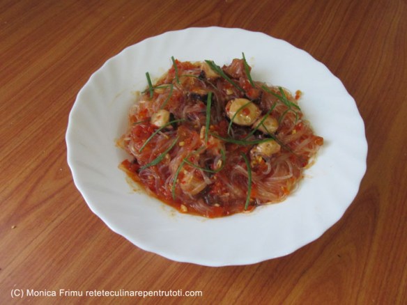 – 1 braț de calamar gigant (130 g), 50 g tăiței de orez, 1 cățel de usturoi (3 g), 3 g ghimbir, 2 linguri pastă de ardei, 2 linguri sos de chilli dulce-acrișor, ½ linguriță piper alb măcinat, 1 lingură ulei de porumb, sare roz, apă, pentru servit o coadă de ceapă verde