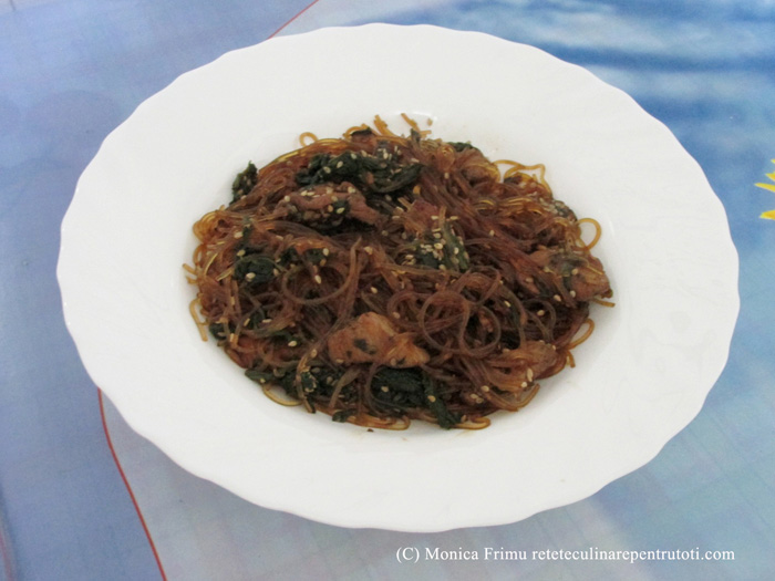 Încălzim 1 lingură ulei de susan într-o tigaie teflonată punem usturoiul, ghimbirul și prăjim 30 secunde. Adăugăm ceapa și amestecăm 1 minut. Punem carnea și gătim 3 minute amestecând din când în când. Adăugăm spanacul, acoperim cu capac și fierbem 4 minute. Scurgem tăieții, punem în tigaie, turnăm 4 linguri sos de soia, sărăm după gust, amestecăm și fierbem descoperit, pe foc mediu, 3 minute. Adăugăm semințele de susan și amestecăm 2 minute. Servim mâncarea caldă.
