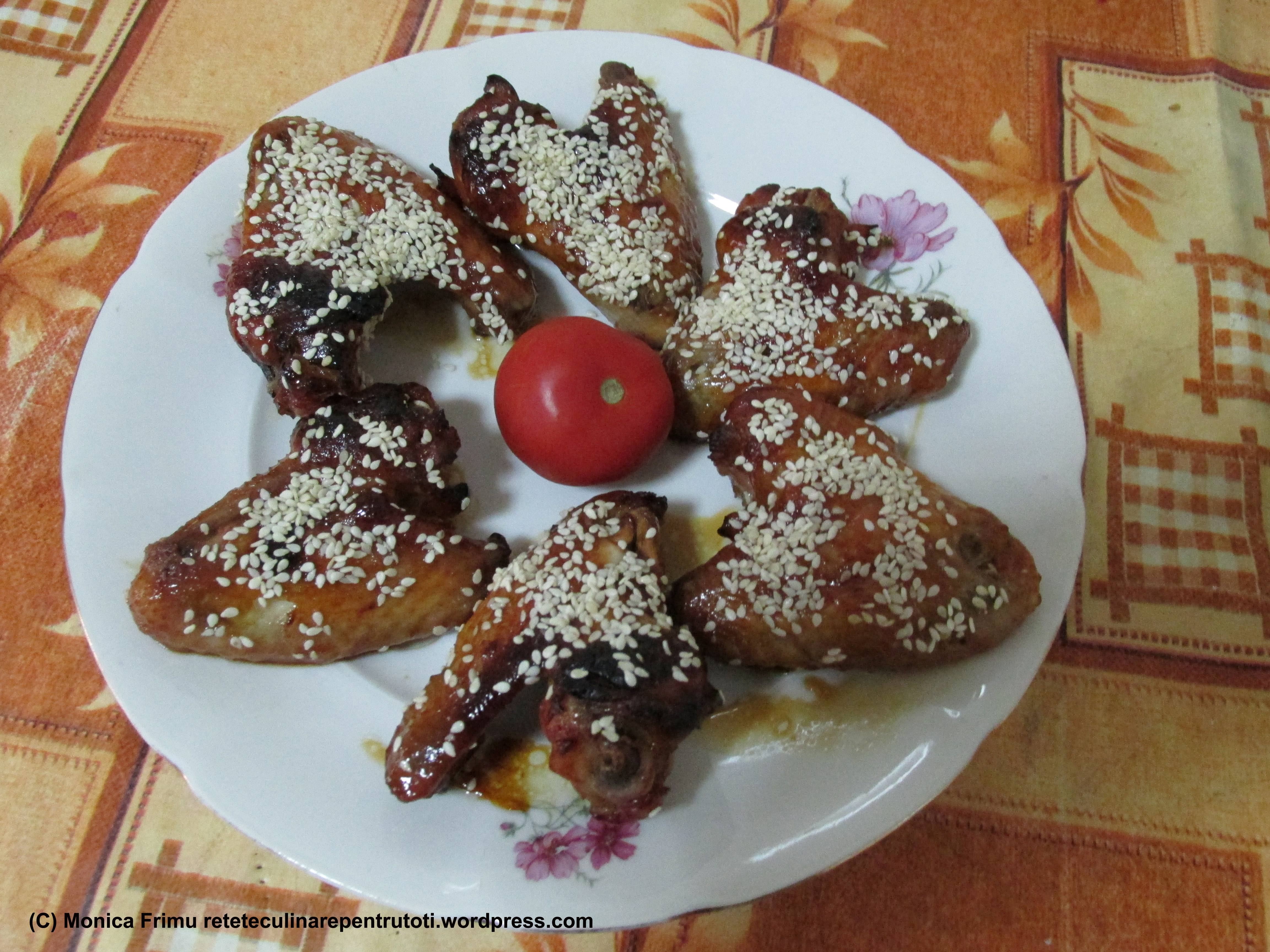În Yena punem 12 aripioare de pui “tăvălite” într-un amestec din 4 linguri sos de soia, 4 linguri sos dulce-acrişor, 1 lingură de miere. Într-o tavă unsă cu puţin ulei punem aripioarele, la cuptor, la foc mai mare, le întoarcem o dată şi le ţinem până sunt rumene. Scoatem şi presărăm cu susan.