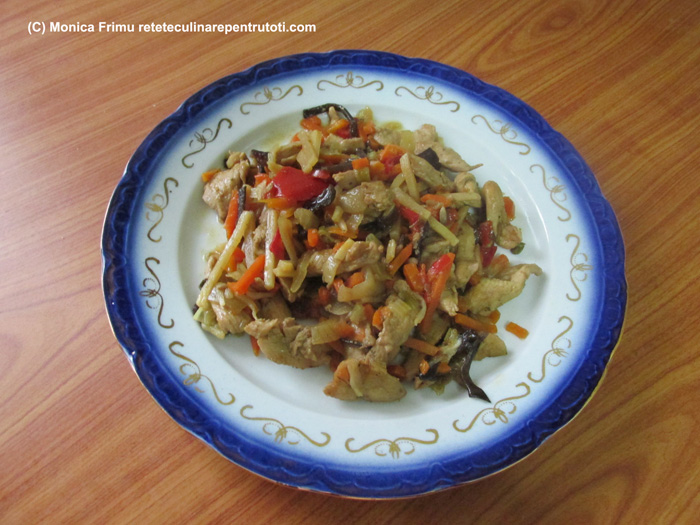 – 200 g piept de pui dezosat și fără piele, 150 g morcovi, câte 50 g ardei galben și ardei capia roșu, 1 ceapă verde, 4 linguri sos teriyaki, ½ linguriță sare, 1 lingură ulei pentru wok