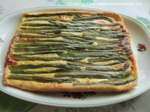 Dezghețăm aluatul, întindem pe o hârtie de copt astfel încât dimensiunile lui să depășească mărimea tăvii, pentru a acoperi și marginile ei. Curățăm sparanghelul, opărim 5 min. în apă clocotită, trecem sub jet de apă rece și scurgem. Amestecăm cele două tipuri de brânză cu sare, piper și ouăle bătute. Întindem compoziția peste aluat, deasupra așezăm firele de sparanghel. Ungem suprafața cu ou bătut. Punem în cuptorul preîncălzit la foc mediu (180) aprox. 30 min., până se rumenesc marginile aluatului. Servim caldă/rece.