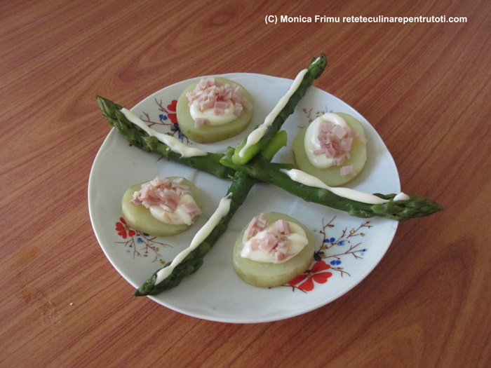 Pe o farfurie așezăm fire de sparanghel, le ungem cu sos. Punem rondele de cartofi, le ungem cu sos și presărăm cu șuncă. Servim cald.