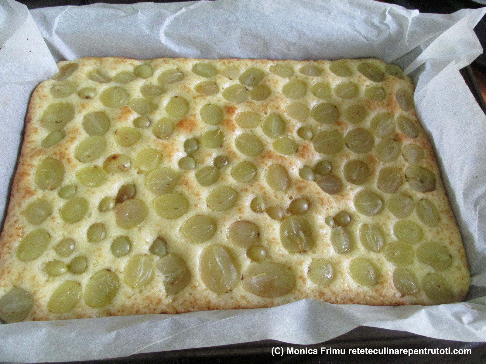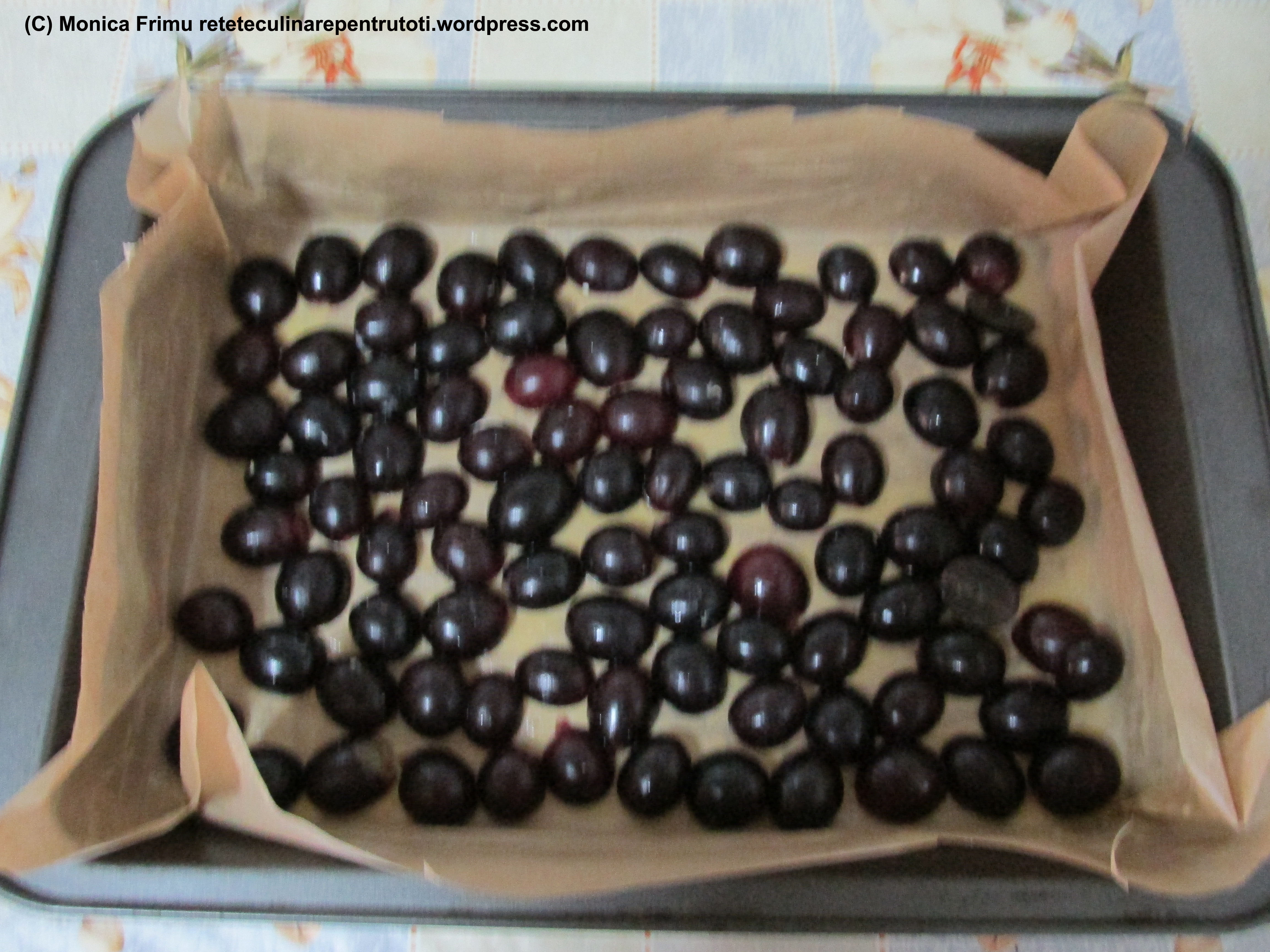 Tăiem boabele de struguri 1/2 pe lungime și îndepărtăm sâmburii. Mixăm ouăle cu zahărul, zahărul vanilat, amestecăm cu iaurtul, esența de rom, coaja de lămâie, făina amestecată cu praful de copt, uleiul turnat câte puțin și omogenizăm. Întindem într-o tavă tapetată cu hârtie de copt, așezăm deasupra boabele de struguri și punem în cuptorul preîncălzit la foc mediu aprox. 25 min., până marginile se rumenesc și se desprind de hârtie.