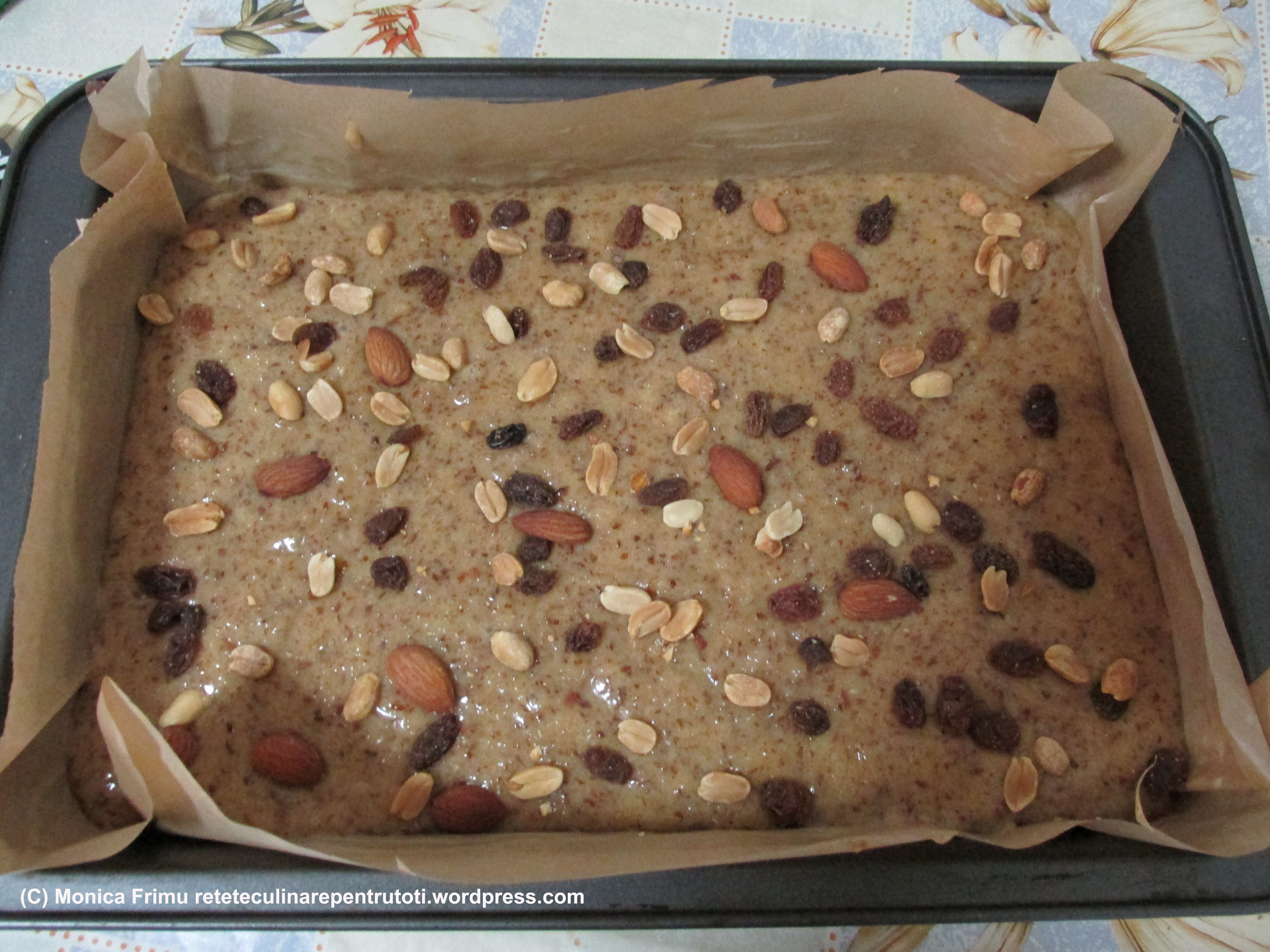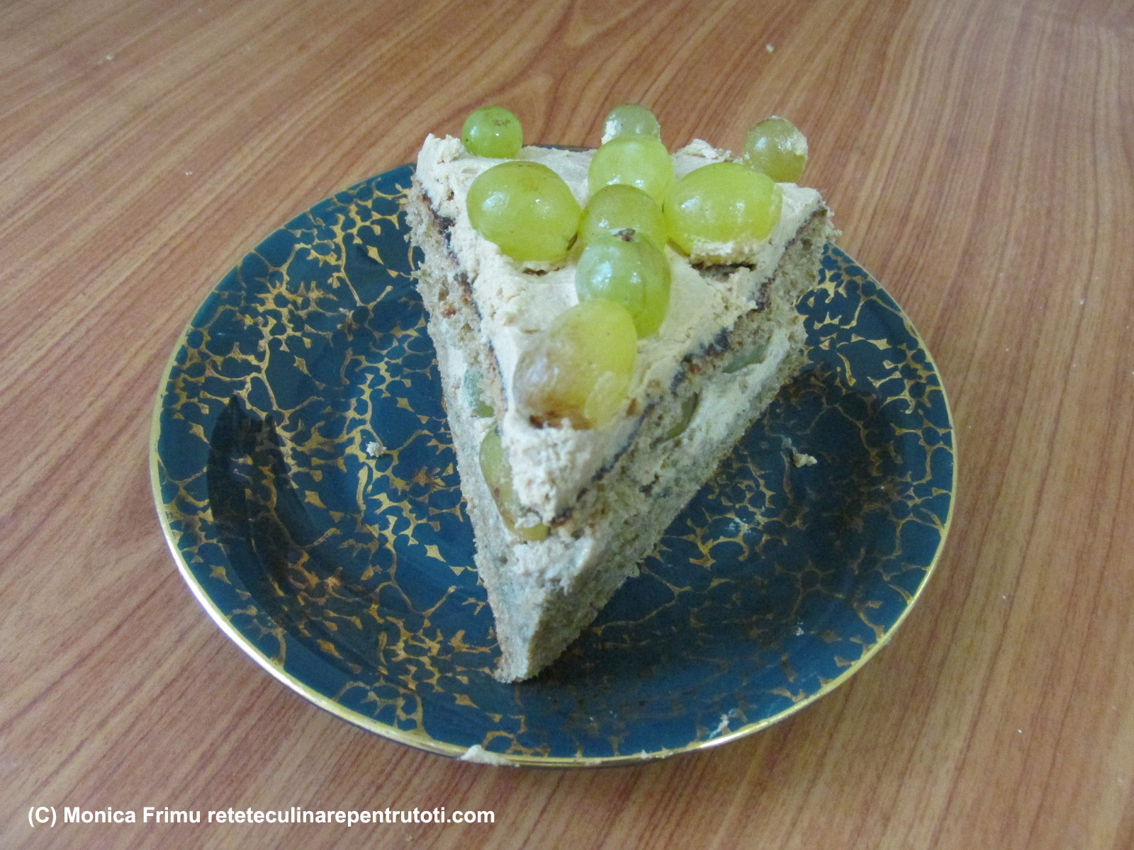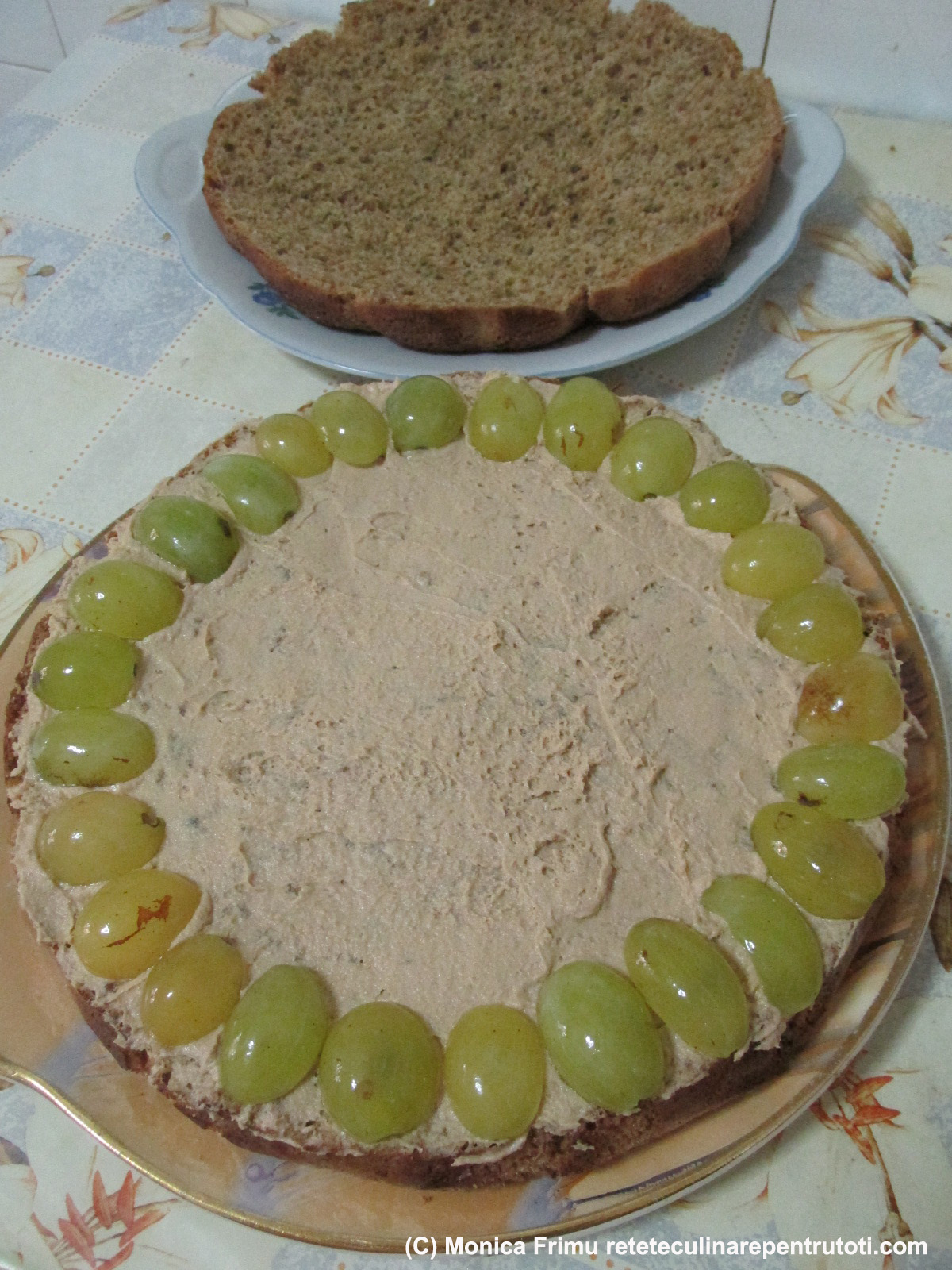 BLAT: 2 ouă, 150 g zahăr, 1 plic zahăr vanilat, 100 ml ulei, 200 g iaurt, 300 g făină, 1 plic praf de copt, 200 g boabe de struguri, esență de rom, 1 lingură coajă rasă de lămâie