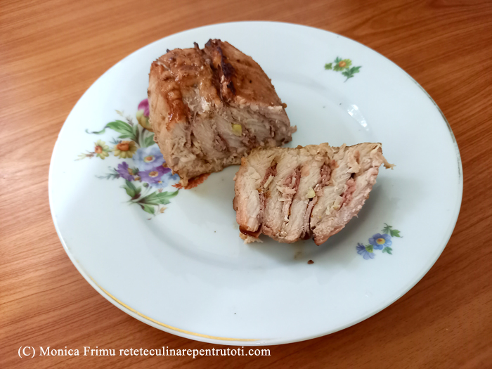 Le pliem la loc și prindem cu scobitori. Așezăm într-o tavă și turnăm 30 ml vin. Punem în cuptorul preîncălzit la foc mai mare (200) și din 15 în 15 minute turnăm câte puțin vin și apă. În total ținem în cuptor 50 minute. Scoatem pe un platou, tăiem felii în direcție inversă față de cum l-am tăiat anterior și servim.