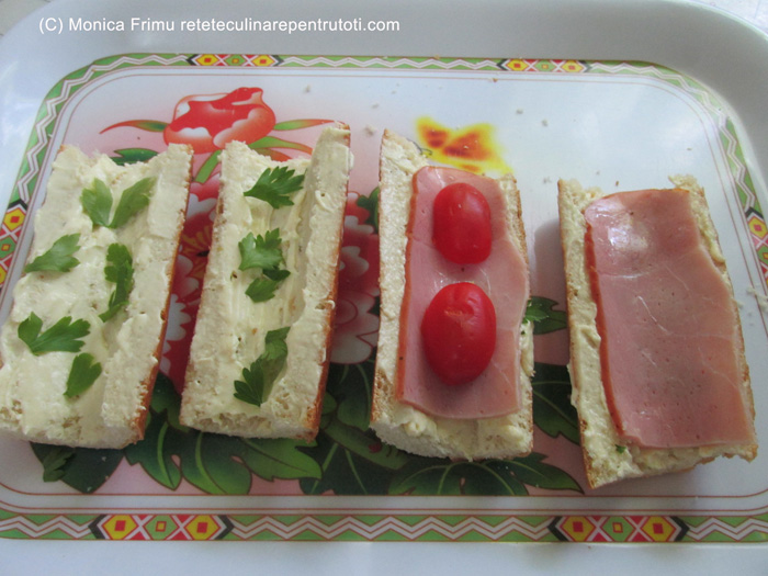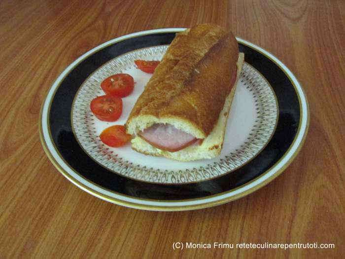 – 1 baghetă, 100 g șuncă de casă feliată (Cristim), 100 g brânză topită cu verdețuri, 3 roșii cireașă, 1-2 fire pătrunjel verde, margarină