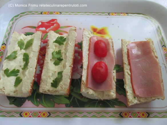 Îndepărtăm colțurile și tăiem bagheta în 3 bucăți. Fiecare bucată tăiem ½ pe lungime și îndepărtăm miezul. Ungem interiorul cu brânză, presărăm frunze de pătrunjel și tapetăm cu felii de șuncă. Într-o bucată de baghetă așezăm o roșie tăiată ½ pe lungime.