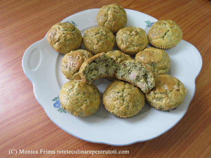 Amestecăm făina cu praful de copt. Tăiem șunca cubulețe, mărarul mărunt. Mixăm albușurile spumă tare cu un praf de sare, adăugăm pe rând gălbenușurile, făina, uleiul și omogenizăm. Încorporăm șunca și semințele de in. Tapetăm formele unei tăvi pentru brioșe cu hârtiuțe și le umplem ¾ cu compoziție. Punem în cuptorul preîncălzit la foc mediu (180) 20 minute. Servim călduțe sau reci.