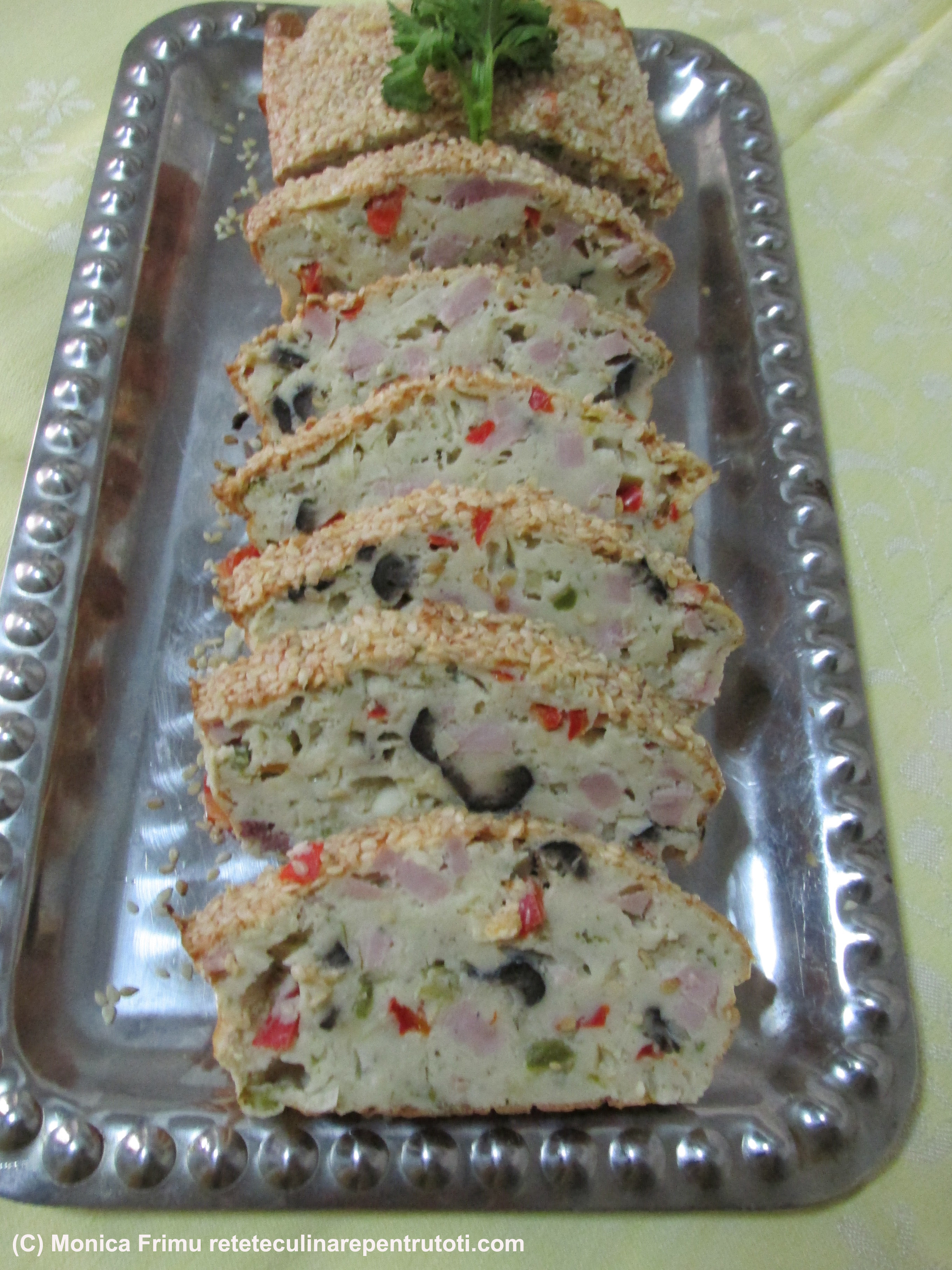 Întindem foaia de aluat pe o folie alimentară, acoperim cu compoziţia, presărăm brânza Brie și șunca.