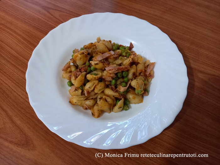 – 250 g paste cochilii mici, 150 g mazăre, 100 g șunculiță țărănească feliată subțire, ¼ ardei iute verde, 150 g kethcup de casă, 1 lingură ceapă verde deshidratată, 1 lingură condimente pentru paste, 1 linguriță mix boabe de piper colorat, sare, 1 lingură ulei, apă
