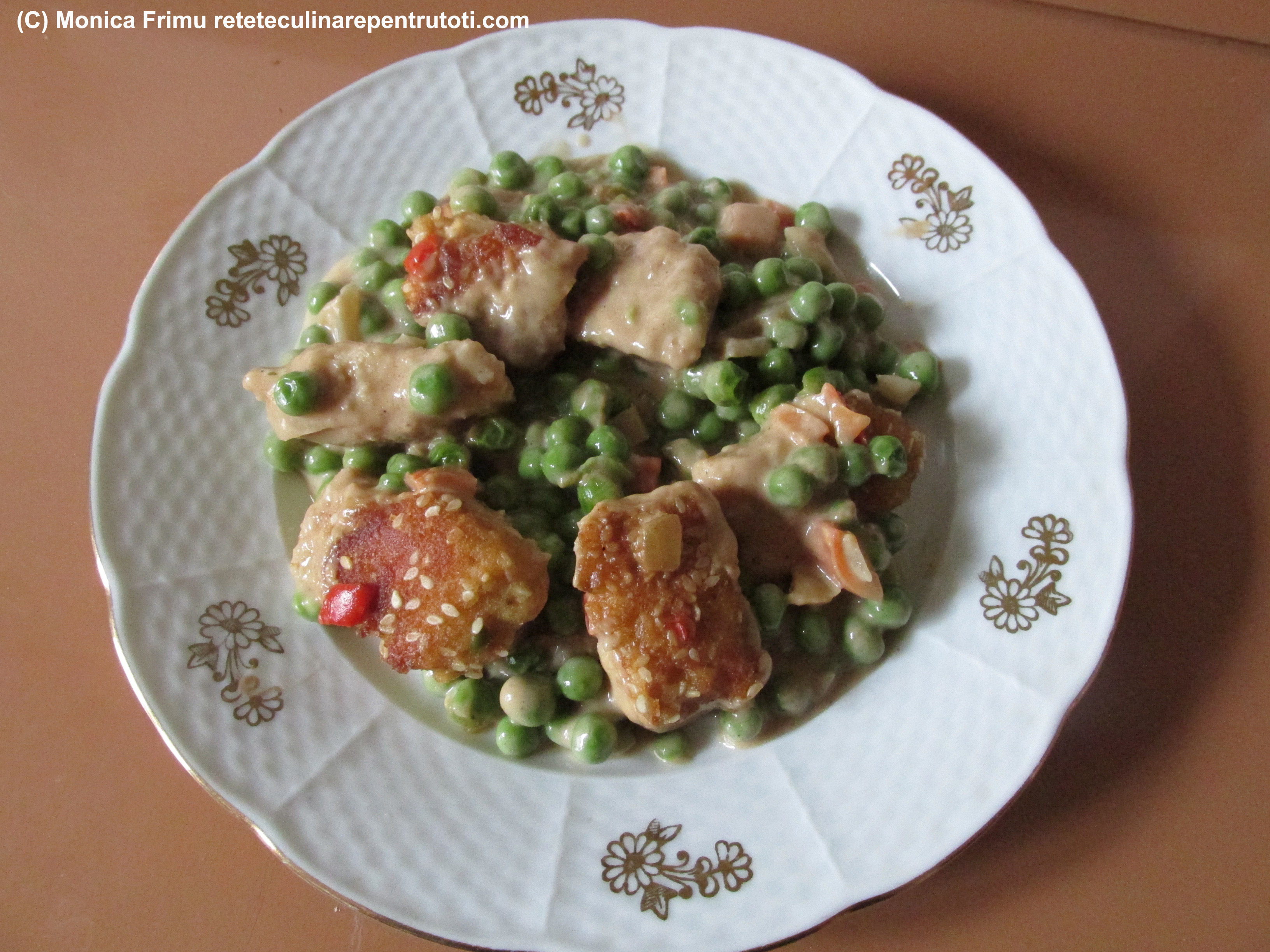 – 1 piept de găină, 1 leg. de zarzavaturi pt. supă, 1 ceapă, câteva boabe de piper negru, 2 linguri de Secretul Gustului, 1 ou, 2 linguri pesmet, 1 lingură semințe de susan, 1 ardei, 300 g mazăre, 300 ml sos de smântână cu cognac, 4 linguri ulei de măsline, 4 l apă