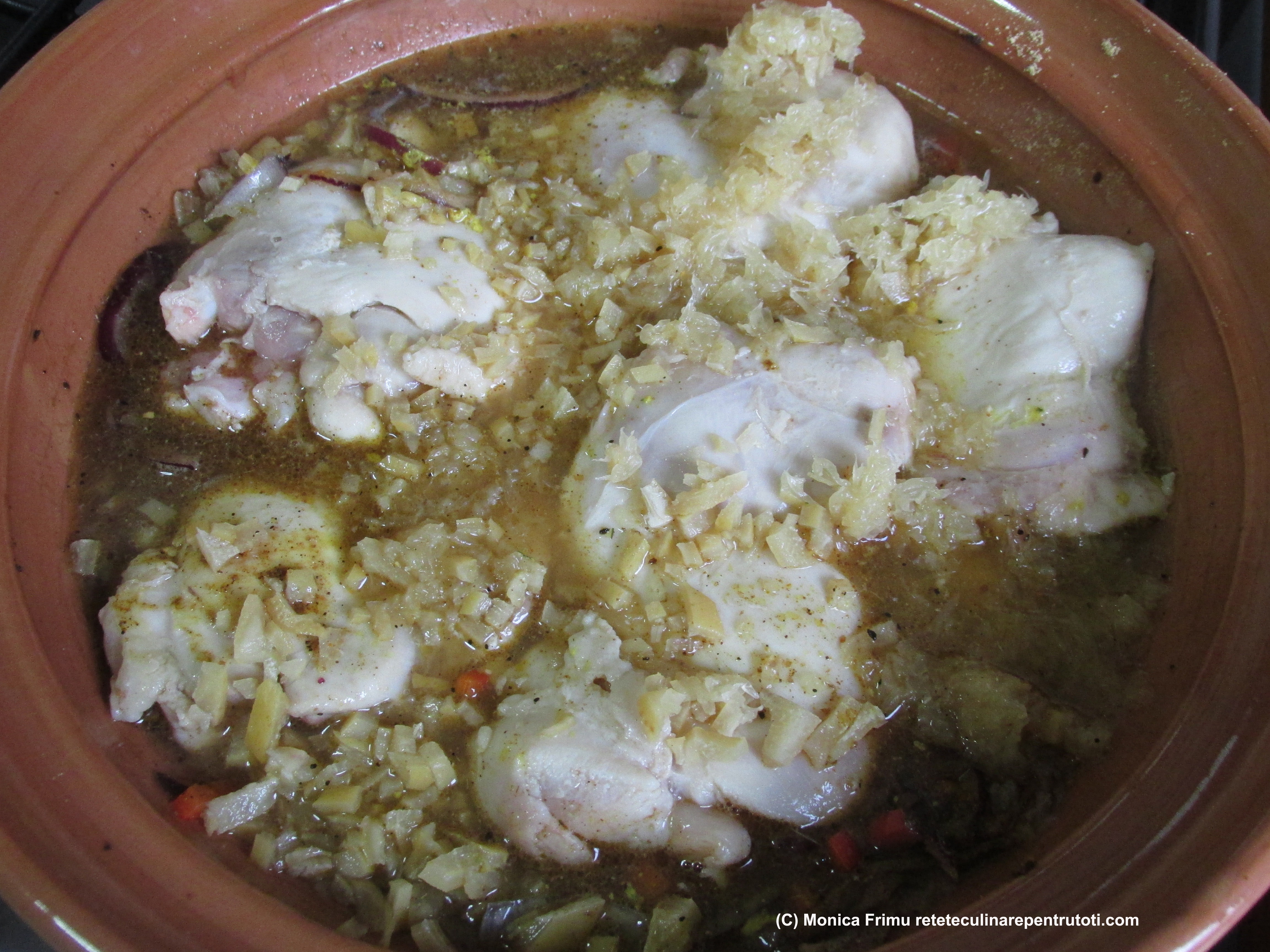 – pt. sos- 30 g unt, 50 ml cognac, 2 linguri praf de ceapă, 70 g pastă de roşii, 150 g smântână, 4 linguri Gustin (amidon alimentar), 100 ml supă de găină, sare